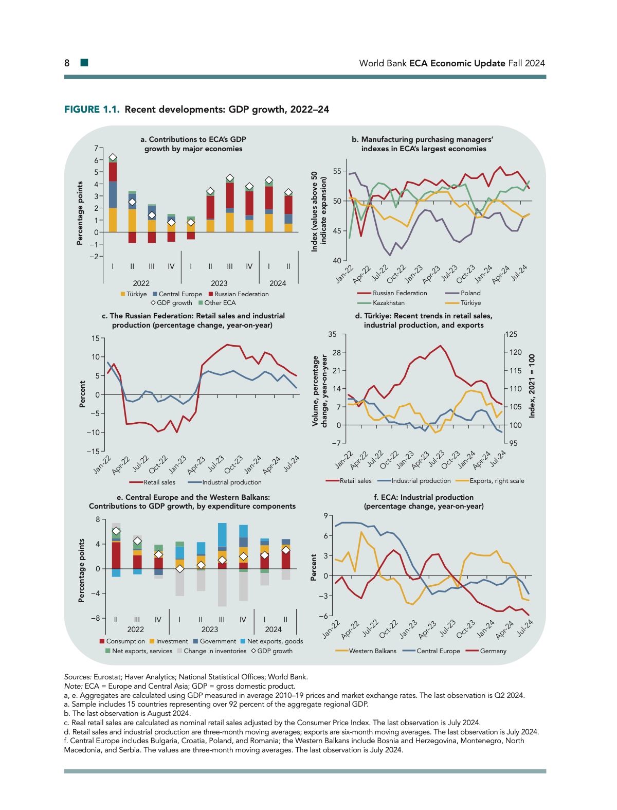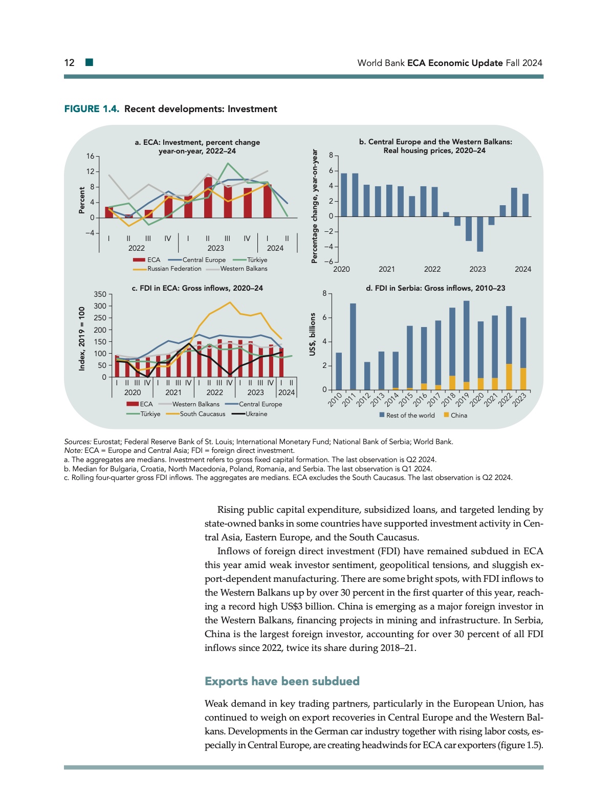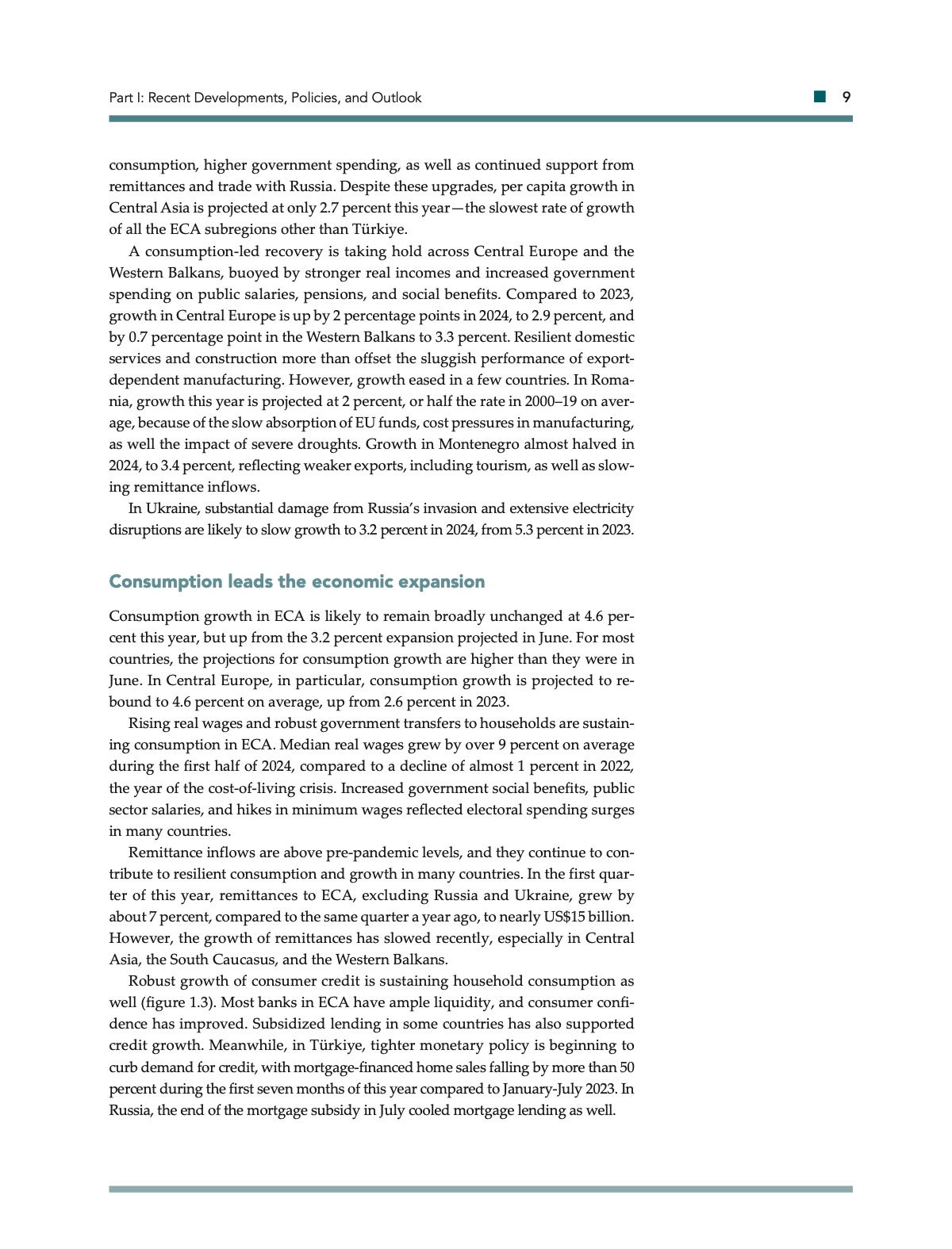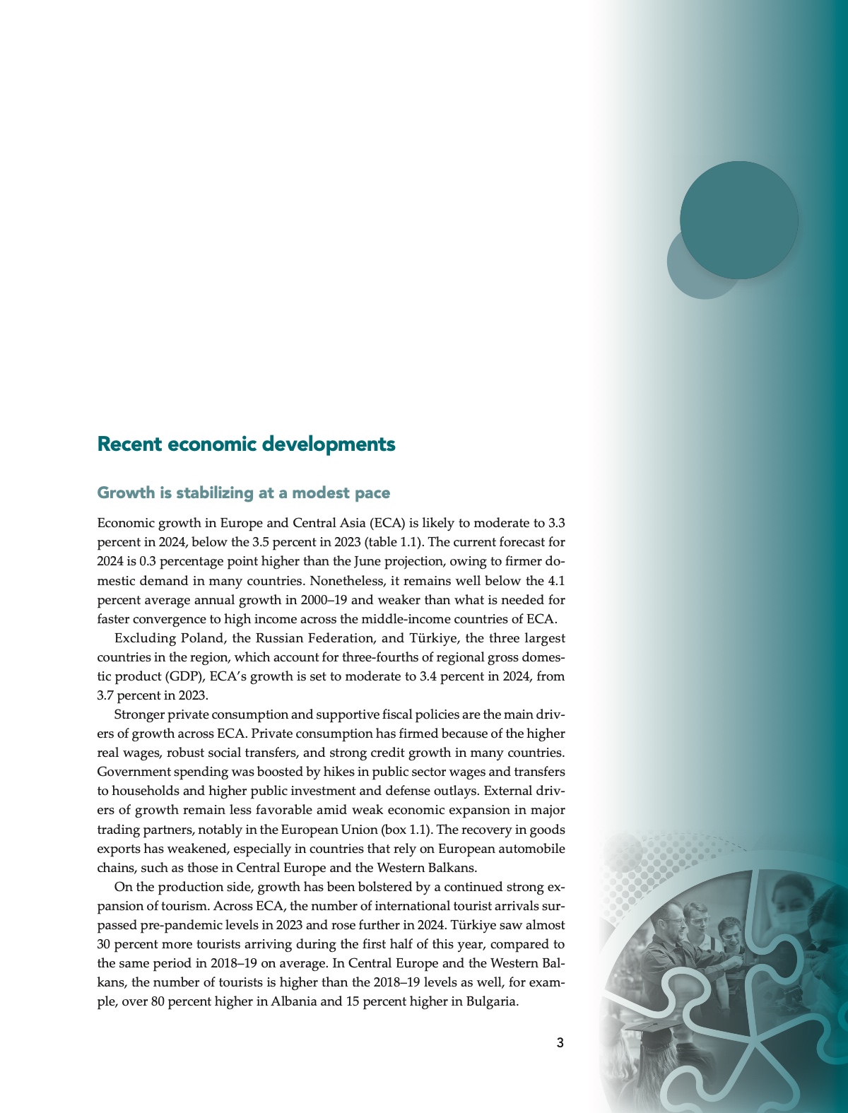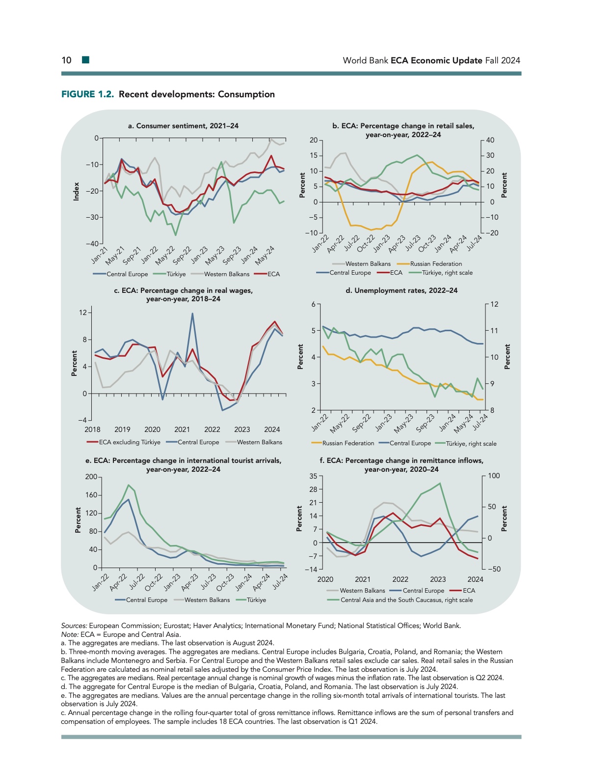 当前,随着工资水平上涨和政府向居民家庭的转移支付增加,以及通胀率下降,个人消费成为欧洲和中亚发展中经济体增长的推动力。汇款流入也超过了疫情前的水平,继续助力西巴尔干、南高加索和中亚地区的经济蓬勃发展。