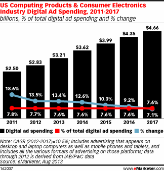 根据eMarketer“2013美国电脑产品和消费电子电子产品:数字广告花费预测和关键趋势”的报告中指出:2012年电脑产品和消费电子产品的数字广告花费达到了28.3亿美元,而且这一数字到2017年将增长至46.6亿美元。尽管当前行业收益低于以往的平均水平,该行业的领军商家正将他们的热销产品广告费用主要投入到了大数据营销上,包括平板电脑,智能手机和其他智能设备。
