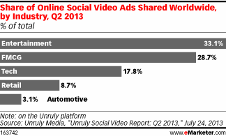 此外,许多高科技公司已经成功播下了社交视频广告的种子,形成病毒式营销。社交视频营销公司Unruly Media报道说,2013年第三季度在他们平台上,高科技公司占网络社交视频广告份额的17.8%,比第一季度的17.0%略有增长。
