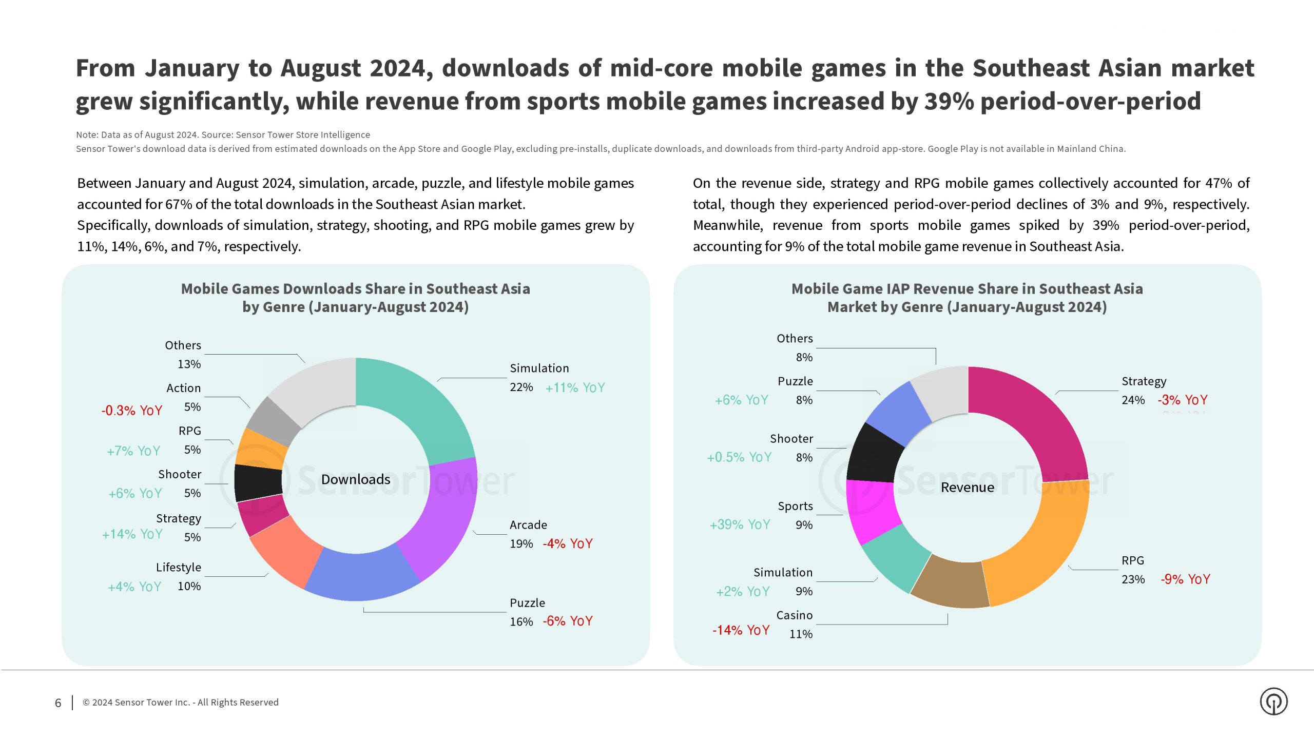 在东南亚地区,模拟游戏是下载量最高的手机游戏类型。2024年1月至8月期间,模拟游戏的总下载量同比增长11%,达到12亿次。