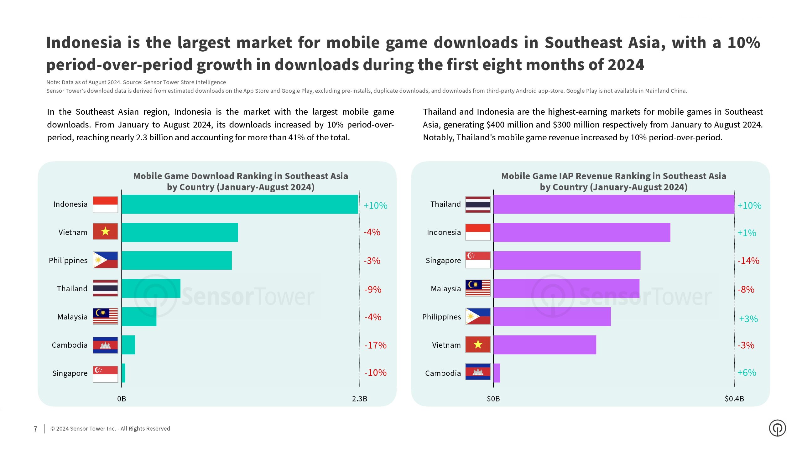 超过41%的东南亚手机游戏下载量来自印尼市场。从2024年1月到8月,印度尼西亚的手机游戏下载量同比增长了10%,成为该指标增长最快的东南亚市场。