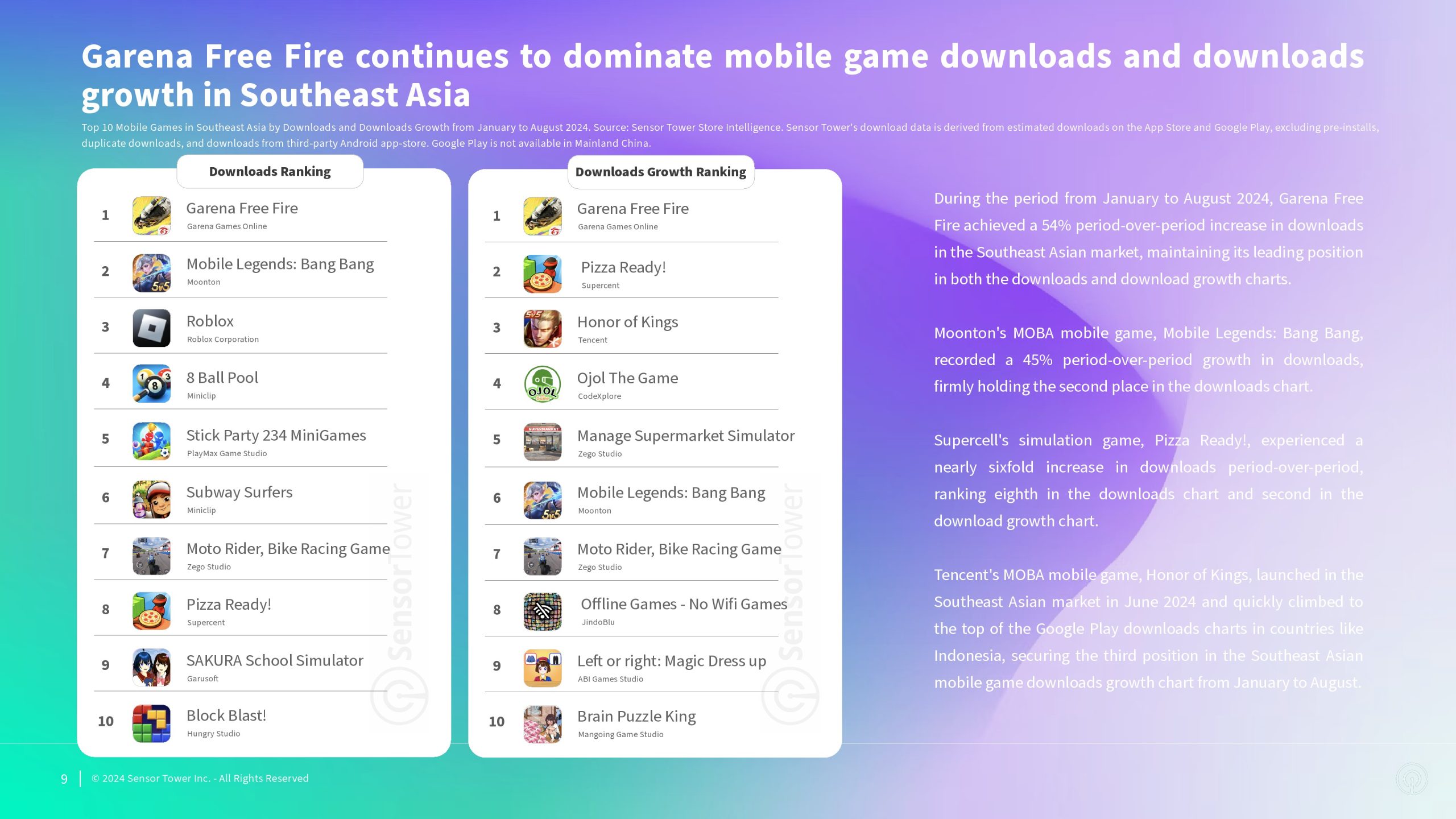 2024年1月到8月,《Garena Free Fire》在印尼市场的下载量同比增长了110%,在整个东南亚市场的下载量同比增长了54%。