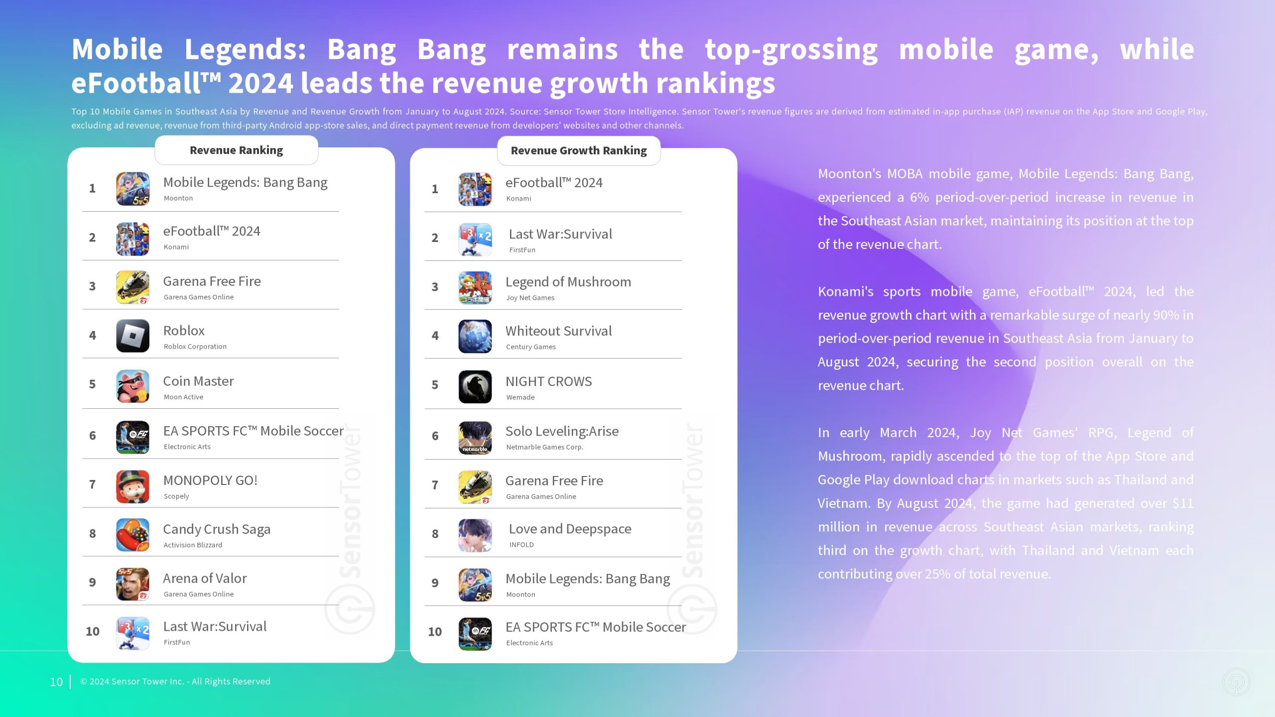 Moonton的MOBA手游《mobile Legends: Bang Bang》在东南亚市场的收益同比增长了6%,保持了收益冠军的位置。