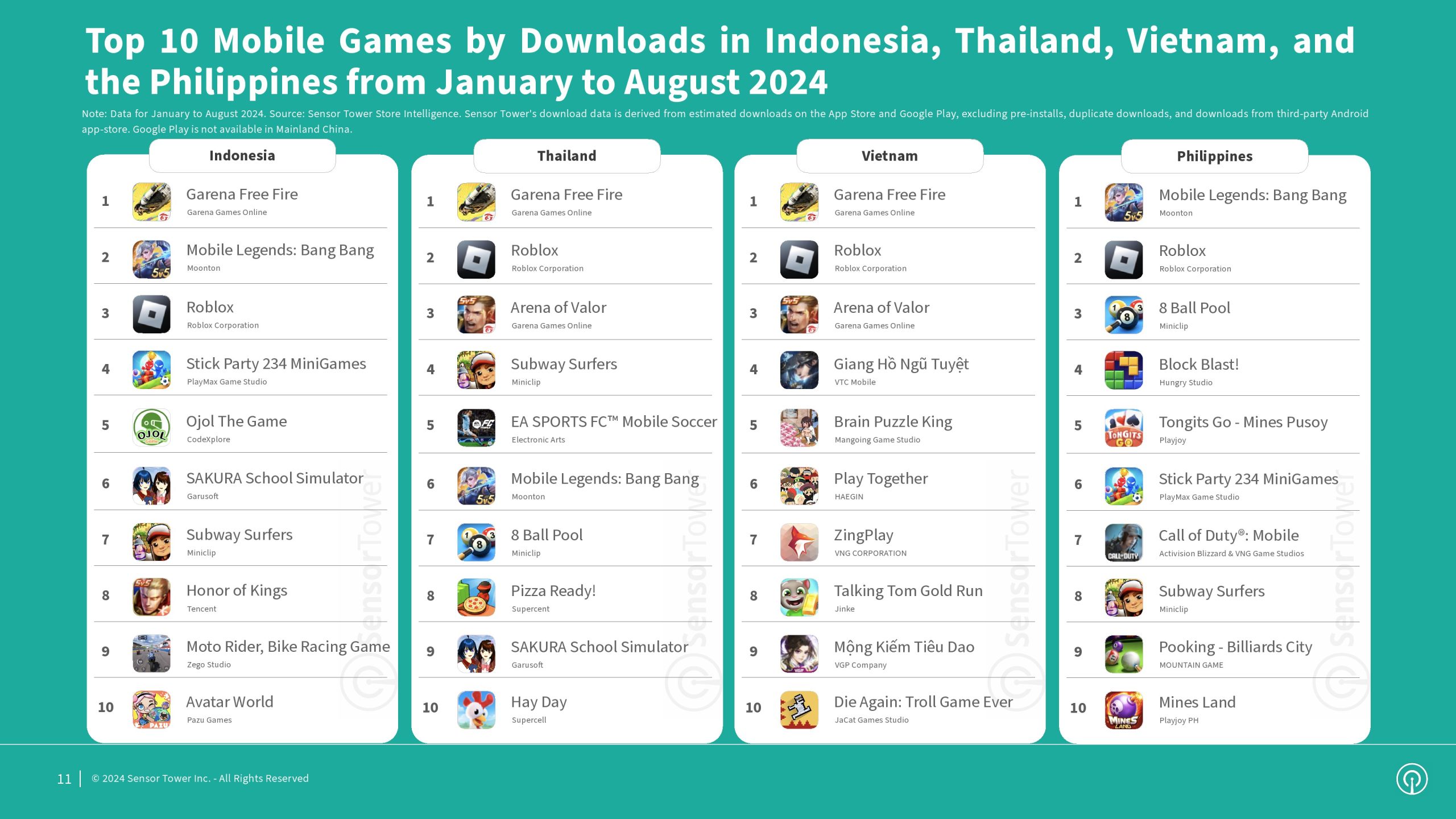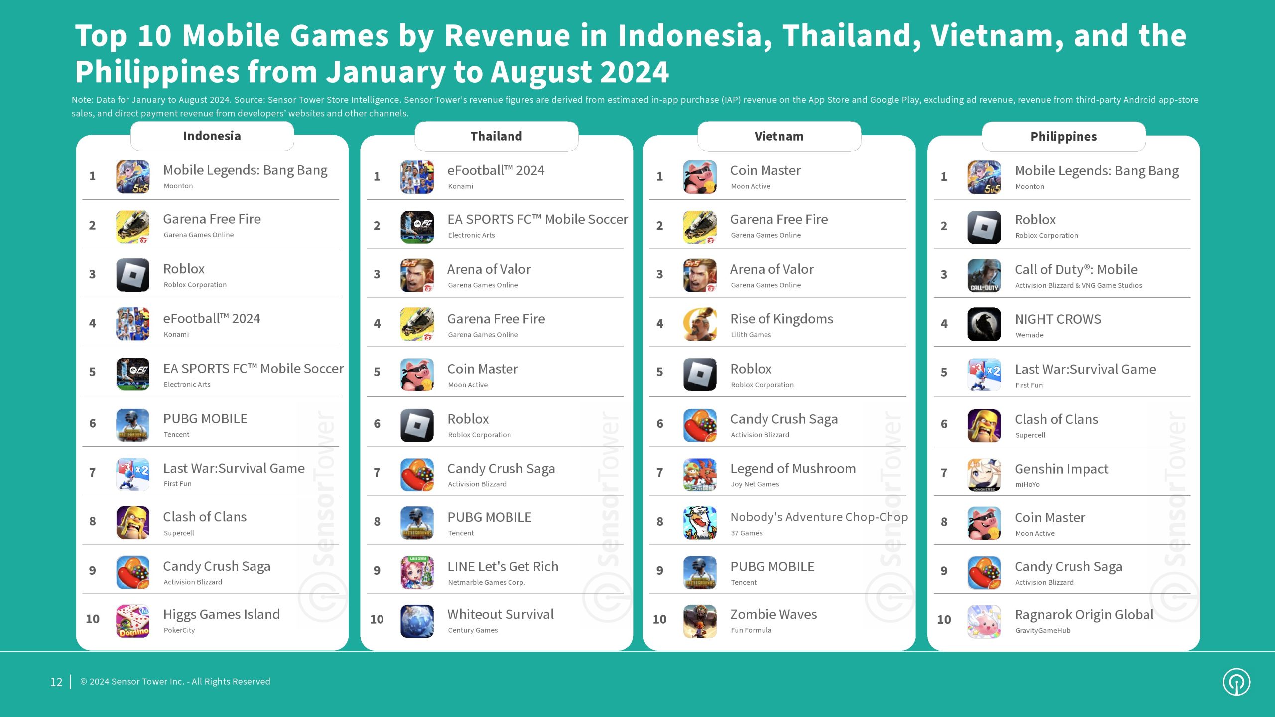 就手机游戏收益而言,泰国是东南亚最大的市场。从2024年1月到8月,这个市场的手机游戏收益同比增长了10%,超过4亿美元。