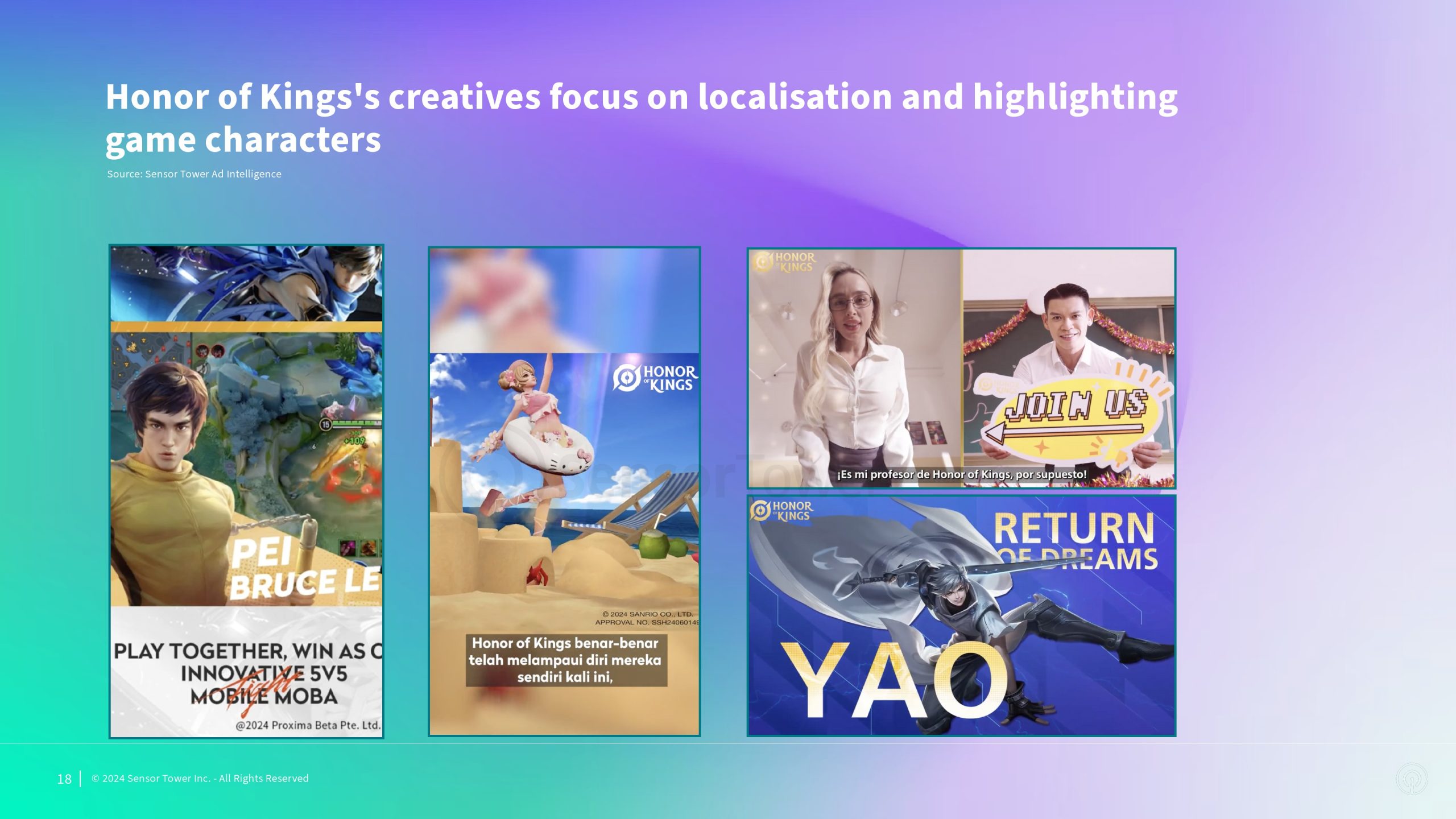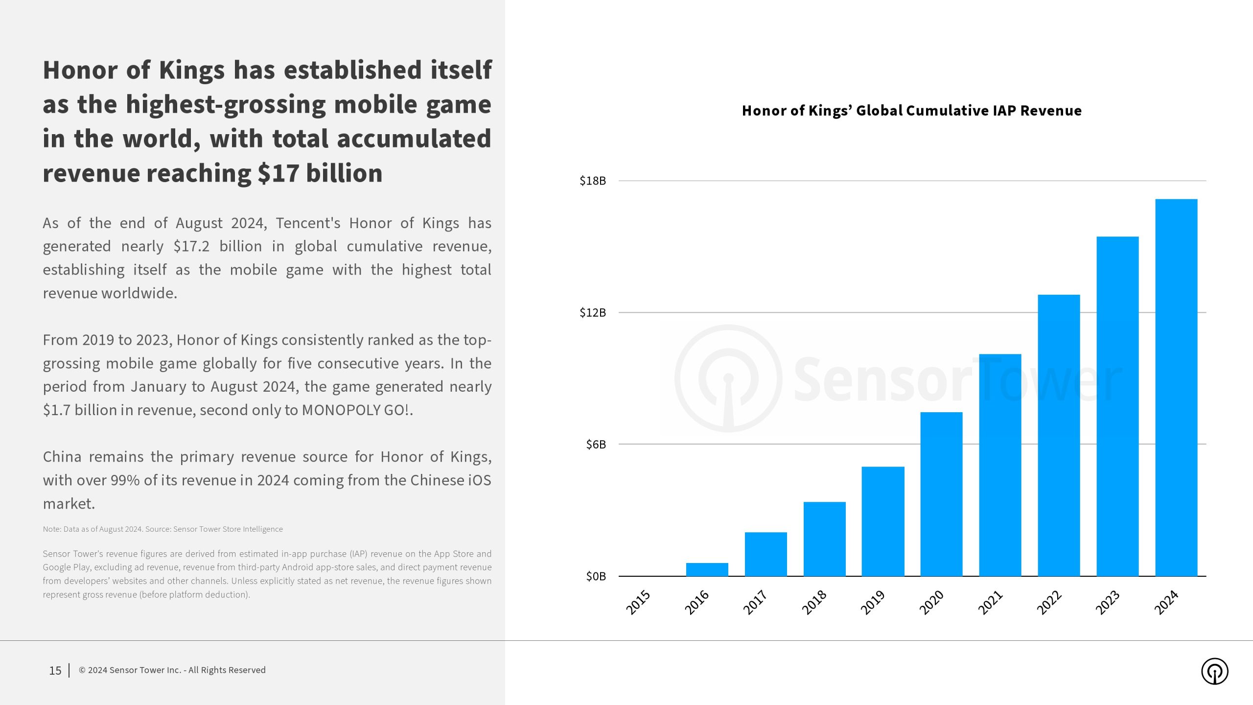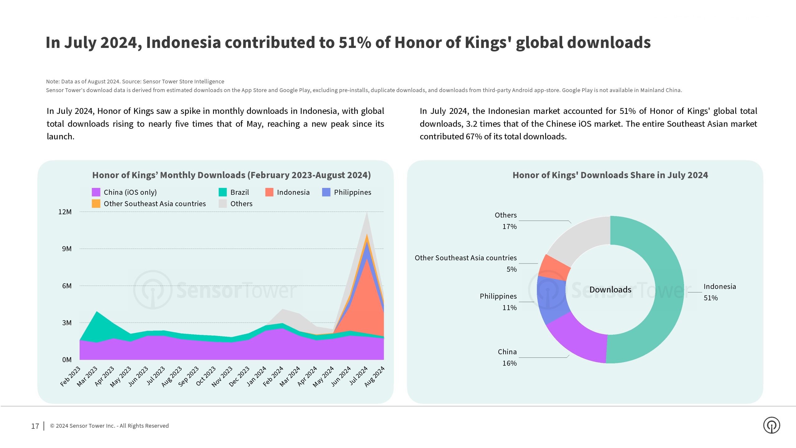Moonton的MOBA手机游戏《mobile Legends: Bang Bang》的下载量同比增长了45%,稳居下载排行榜第二位。印度尼西亚是这款游戏下载量最高的市场,占2024年1月至8月全球总下载量的44%。