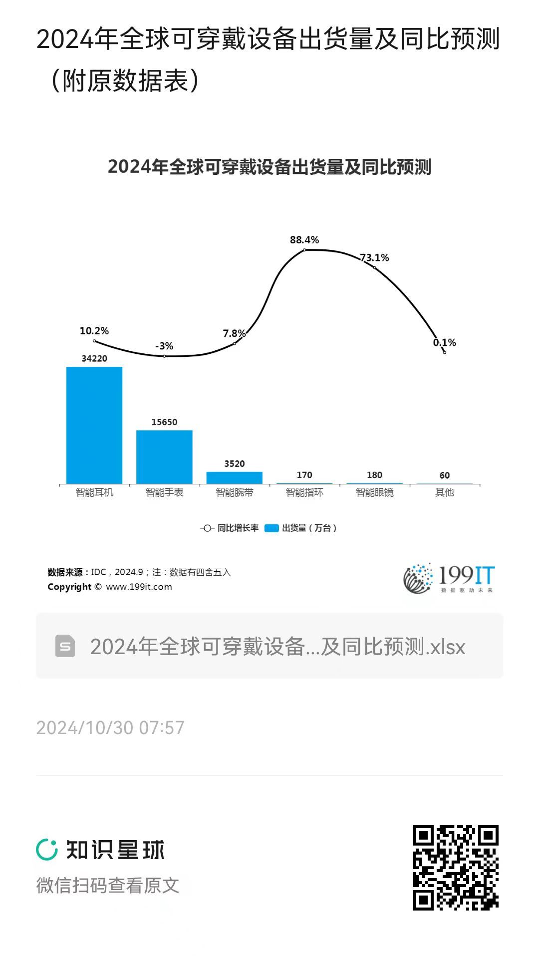 - 2020和2024年全球可穿戴设备出货量及增长率(附原数据表)