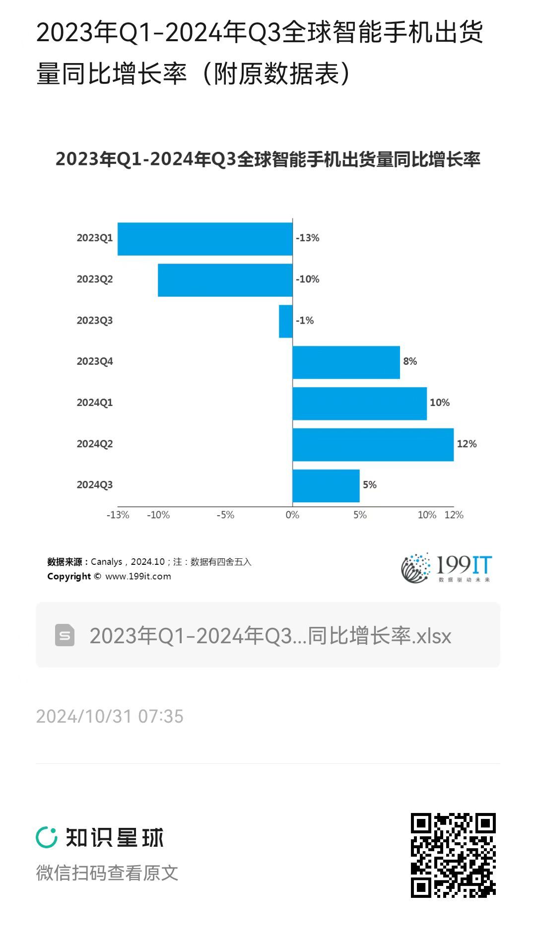2023年Q1-2024年Q3全球智能手机出货量同比增长率(附原数据表) ​​​