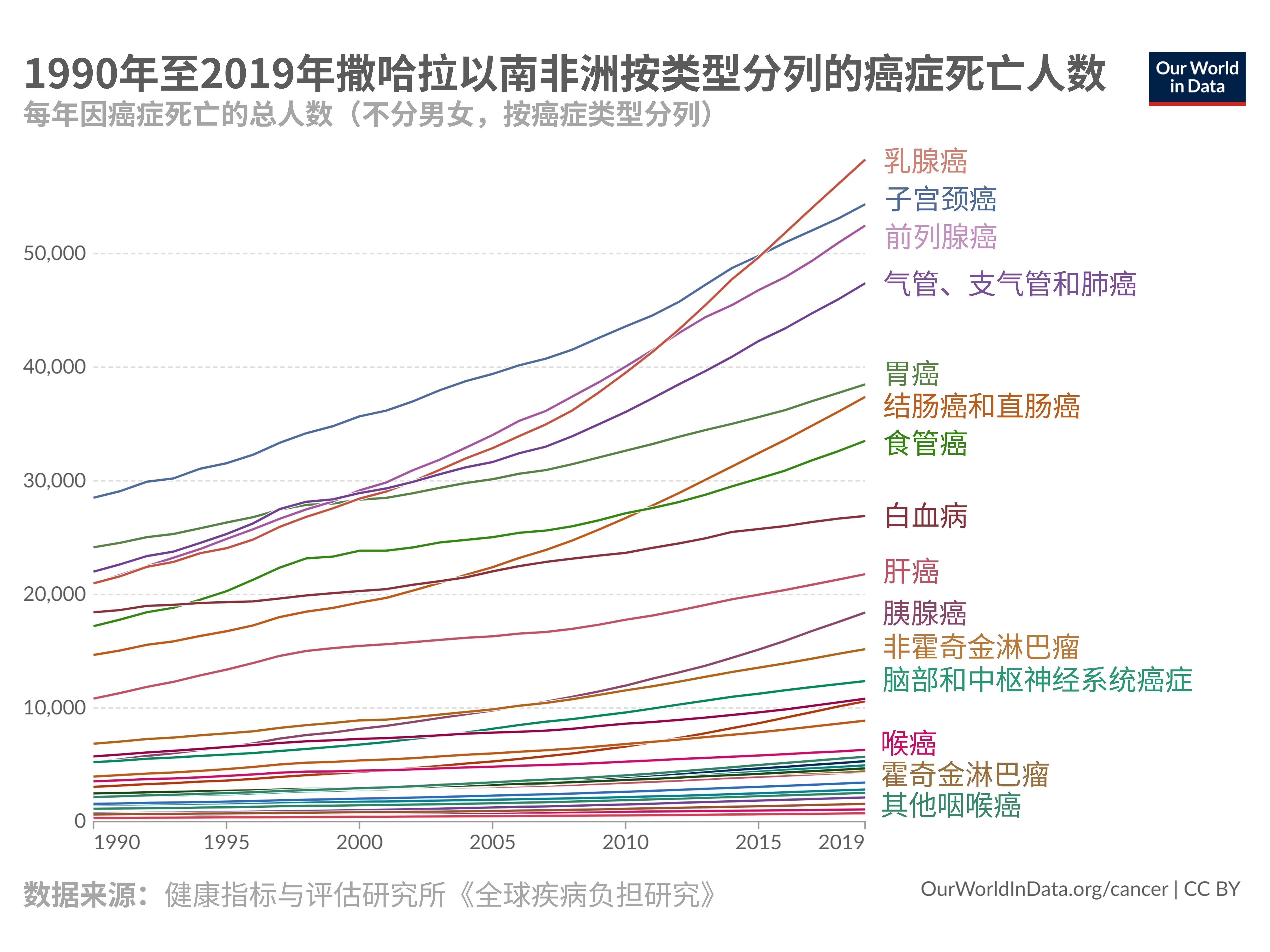 宫颈癌发病率最高的地区是撒哈拉以南非洲、中美洲和东南亚。宫颈癌是撒哈拉以南非洲女性癌症死亡人数第二多的疾病,死亡率在 1990 年至 2019 年间增加了一倍多,如下图所示。