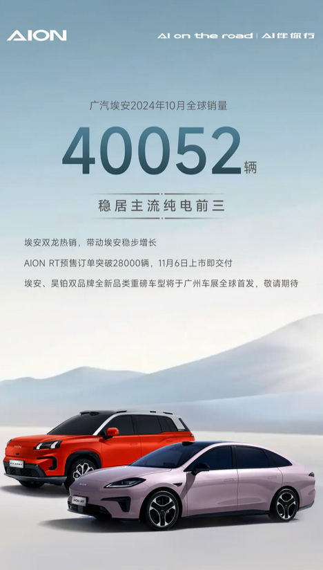 广汽埃安:2024年10月份全球销量超过40052辆 广汽埃安在11月1日宣布,10月份全球销量超过40,052辆。 其中AION RT自9月底开启预售以来,订单量已超过28,000台 自 快科技 更多阅读:广汽埃安:2023年4月广汽埃安销售41012辆汽车 同比增长302%广汽埃安:2022年10月广汽埃安销量达30063台 同比增长149%广汽埃安:2024年1月广汽埃安全球销量为24947辆 海外销量首次突破3000大关广汽集团:2025年1月份广汽集团共计销售98437辆 同比下滑25.41%广汽:2024年上半年广汽埃安累计销量为177366辆 同比下滑15.3%乘联会:2022年1月份新能源轿车销量排行榜易车网:2025年2月汽车销量榜 比亚迪超32万辆继续领跑乘联会:2022年8月新能源市场特斯拉总上险量超过3.5万辆乘联会:2023年12月新能源乘用车厂商批发销量预计将达113万台 比亚迪独占1/3广汽埃安:截至2023年8月AION S系列累计销量超40万 A级纯电轿车第一乘联会:2022年7月国内狭义乘用车市场销量达181.8万辆 同比增长20.4%乘联会:预计2023年新能源车销量850万辆 渗透率将达36%乘联会:2022年6月国内狭义乘用车市场销量达194.4万辆 同比增长22.7%乘联会:2022年5月国内新能源狭义乘用车销量达36万辆 同比增长91.2%广汽埃安:2022年1-12月埃安累计销量27.1万辆 同比增长126%