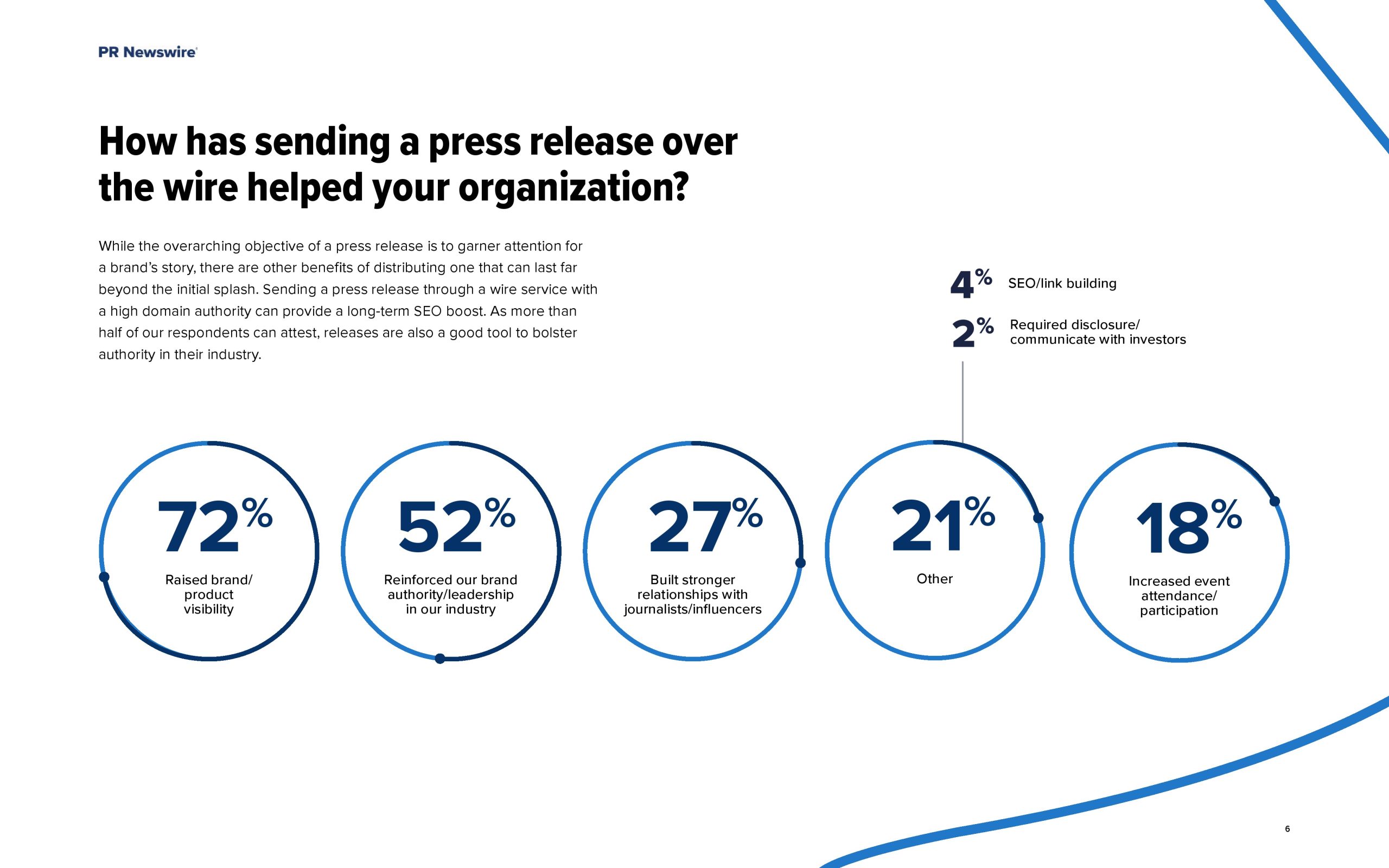根据美通社(PR Newswire)的一份报告,传播专业人士认为通过有线服务发送新闻稿可以提高品牌/产品的知名度(72%),并增强品牌在行业中的权威/领导地位(52%)。