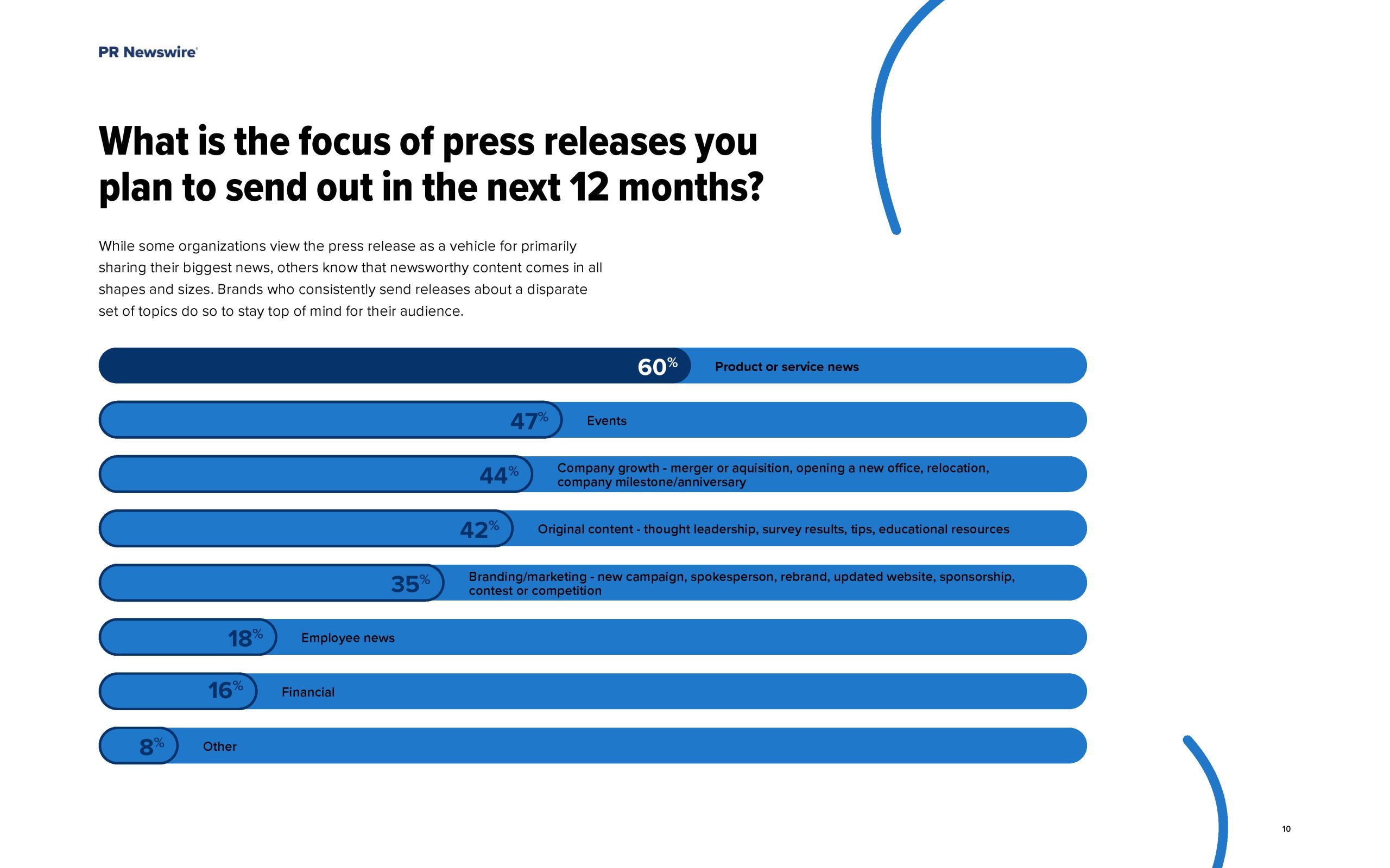 6 / 10的受访者表示,明年发布的新闻稿的重点是产品或服务新闻,其他重要领域将是事件(47%)、公司增长(44%)和原创内容(42%)。