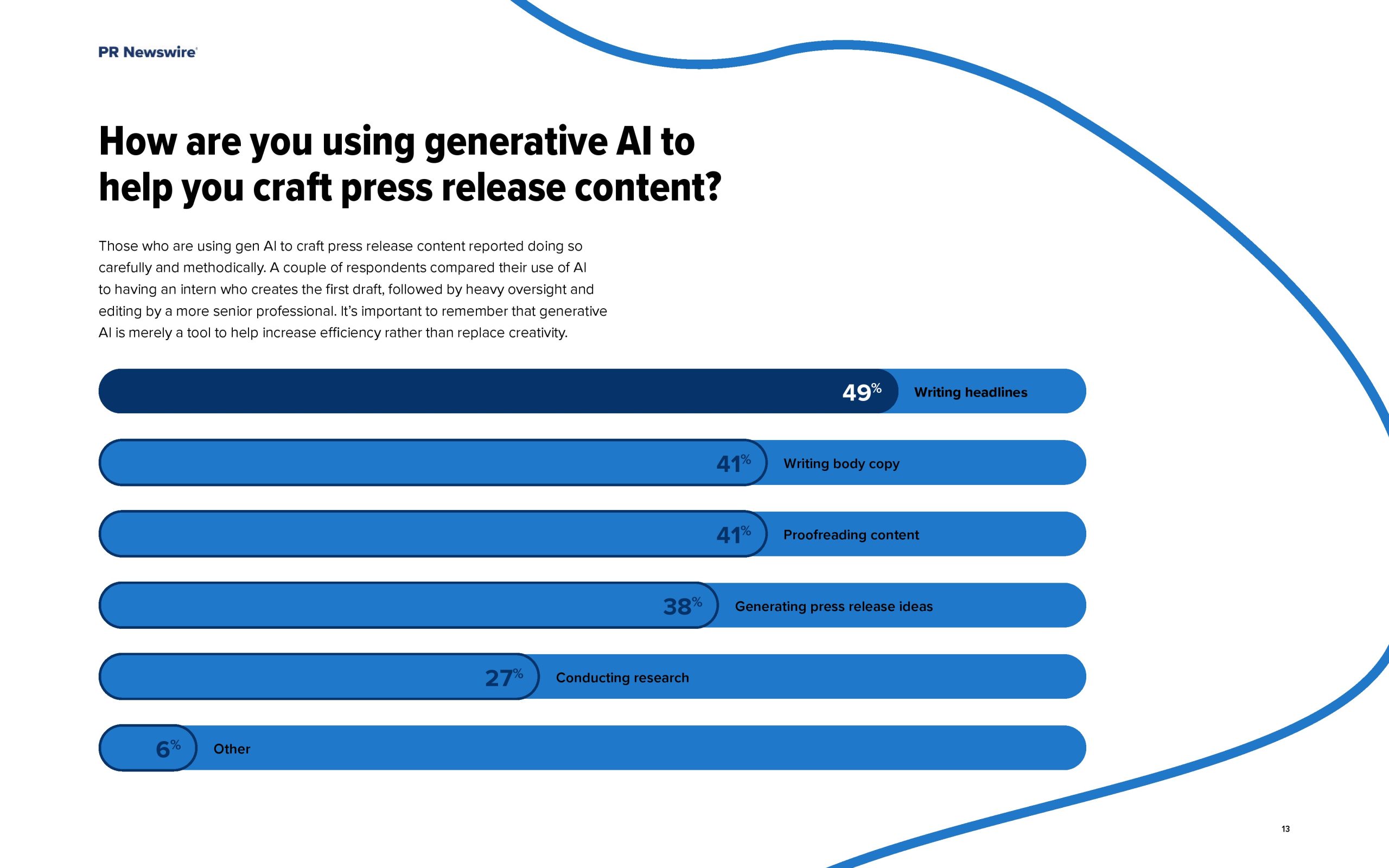- 在本次调查的受访者中,人工智能在撰写标题方面的作用最大,其次是撰写正文和校对内容。
