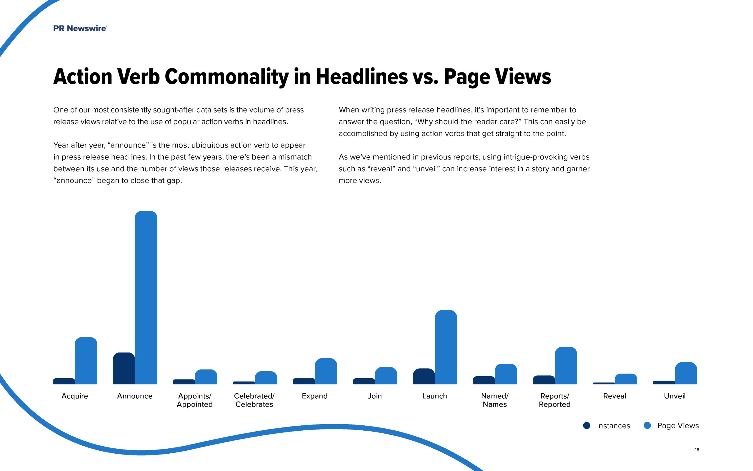 - 在分析新闻稿中的动词时,最常见的是“宣布”这个词——这也是获得最多页面浏览量的一个。