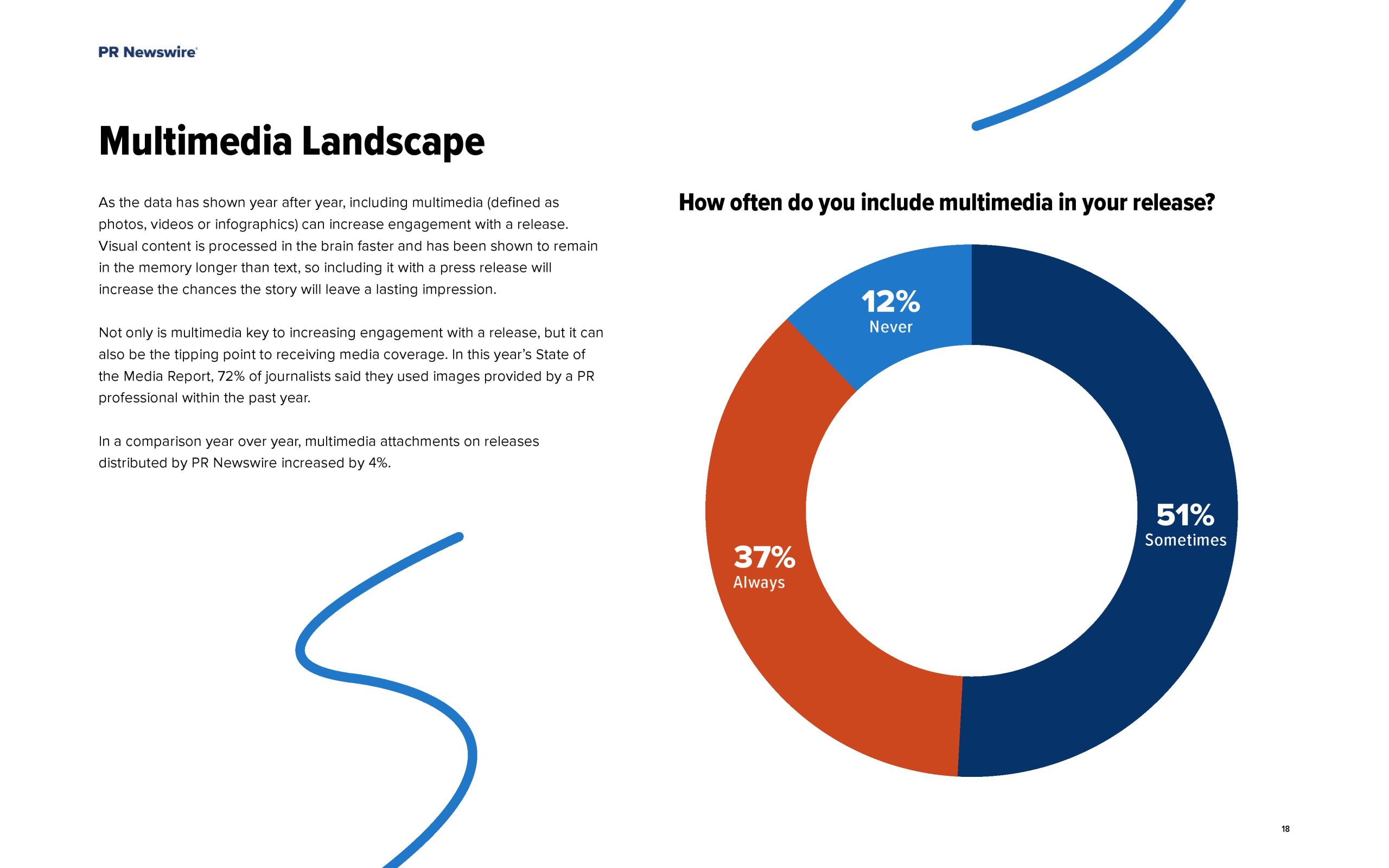 - 约88%的受访者总是(37%)或有时(51%)在他们的发行中使用多媒体。