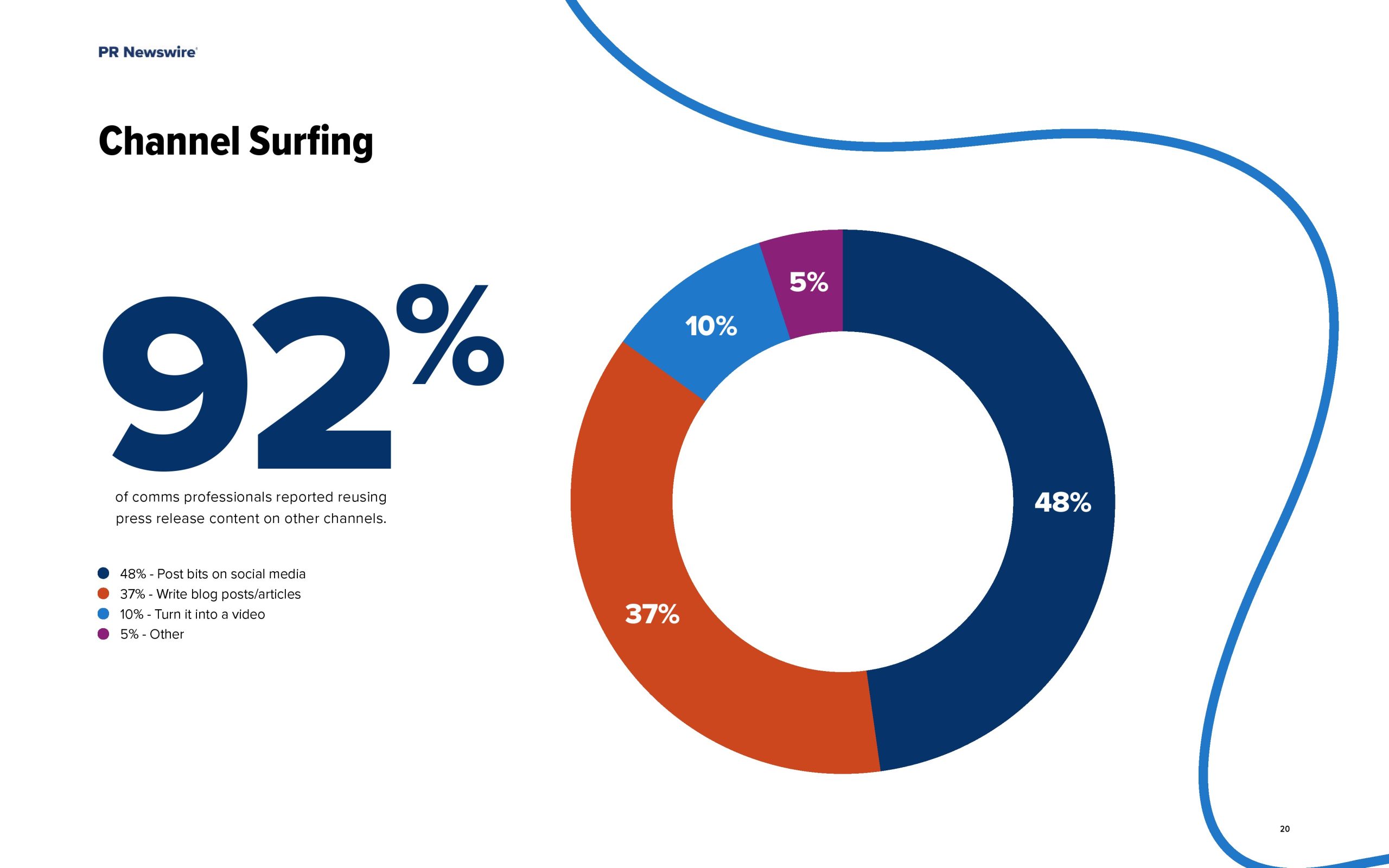 由于新闻稿面临的最大挑战是它们不能产生预期的媒体报道,受访者转向不同的渠道来分发这类内容。事实上,92%接受调查的通信专业人士表示,他们在其他渠道上重复使用新闻稿内容。其中最常见的方式是在社交媒体上发帖(占48%),其次是写博客文章(占37%)。