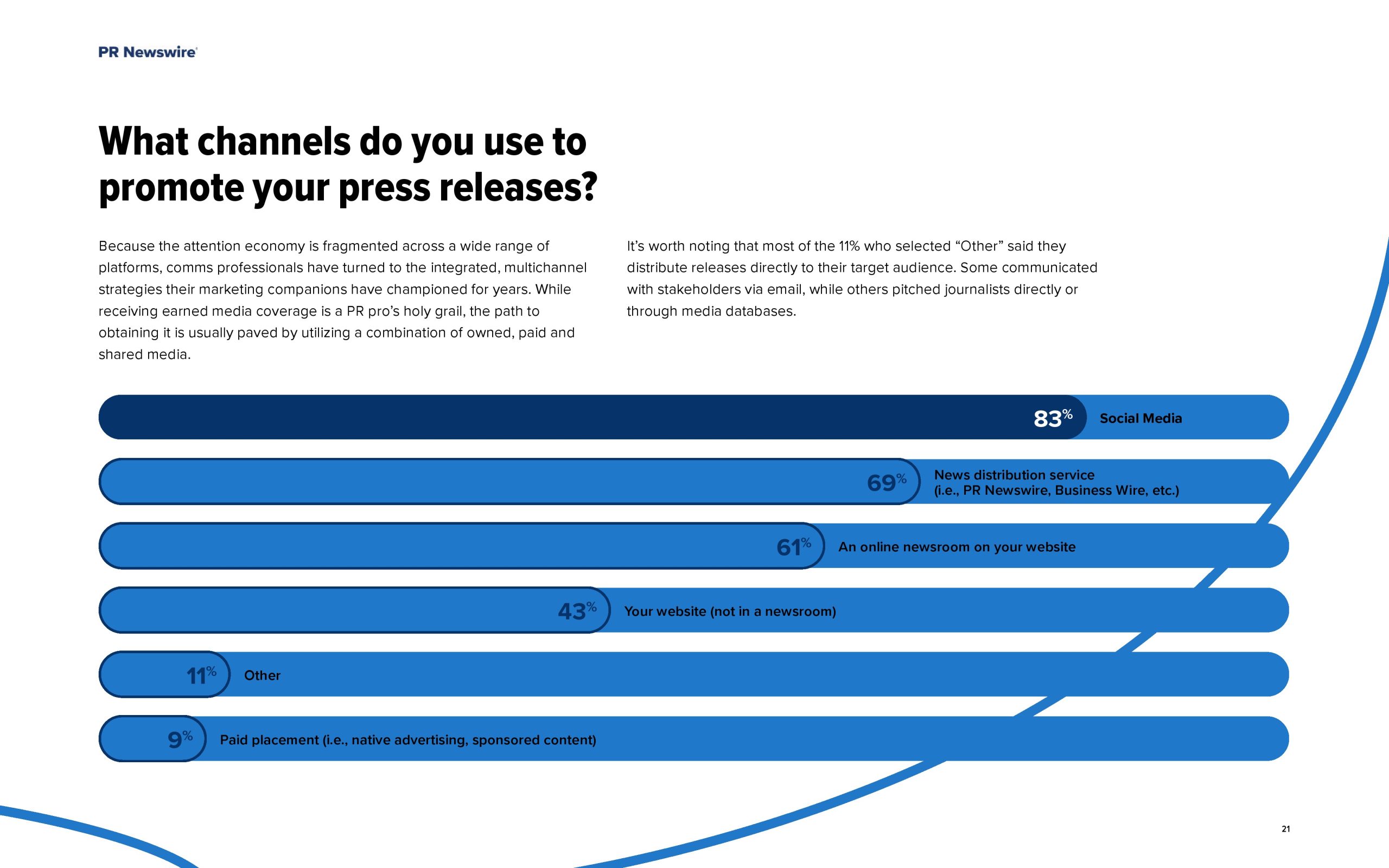 此外,通信专业人员正在混合使用付费、自有和免费媒体来宣传他们的新闻稿。新闻发布推广的主要渠道是社交媒体(83%),其次是新闻分发服务(69%)和网站上的在线新闻编辑室(61%)。大约9%的人会选择付费广告,如原生广告或赞助内容。