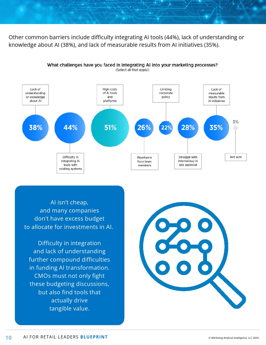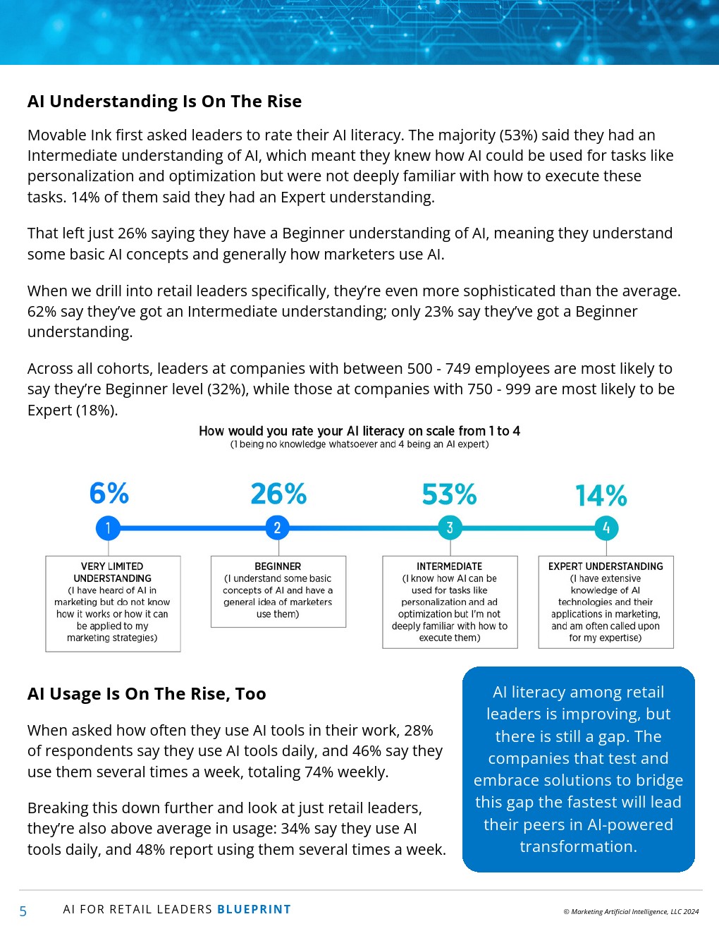 Movable Ink首先要求领导者对他们的人工智能素养进行评估。大多数人(53%)对人工智能有中等程度的了解,这意味着他们知道如何将人工智能用于个性化和优化等任务,但不太熟悉如何执行这些任务。