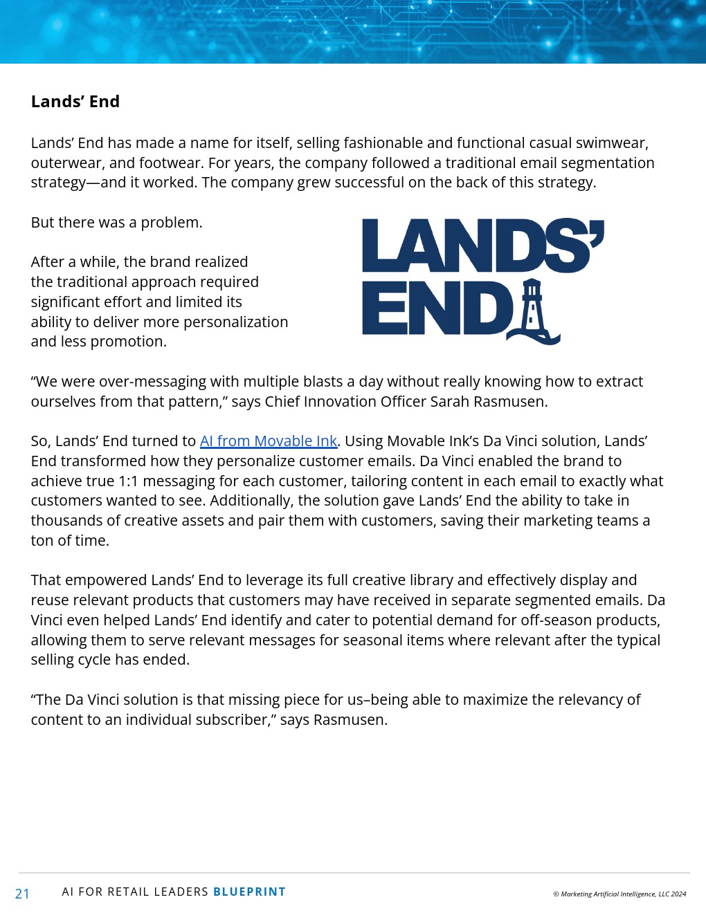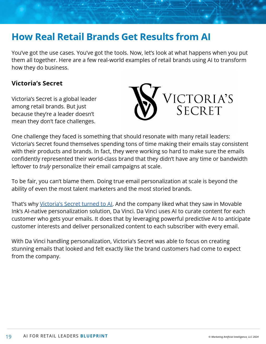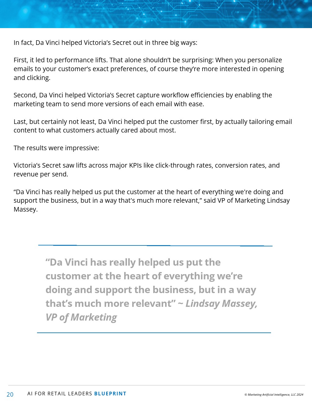 事实上,像维多利亚的秘密和Lands ‘ End这样的顶级品牌已经在使用人工智能来做一些事情:显著提高电子邮件的点击率、转化率和每次发送的收入,显著提高零售业务的效率和收入增长,以及高度个性化的面向客户的沟通,在正确的时间显示正确的信息。