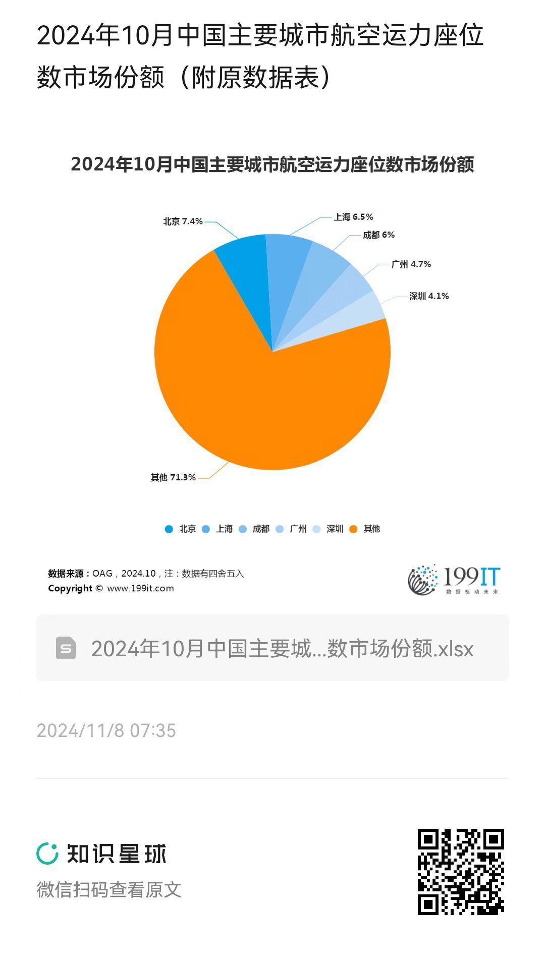 - 2024年11月中国主要城市航空运力座位数市场份额(附原数据表)
