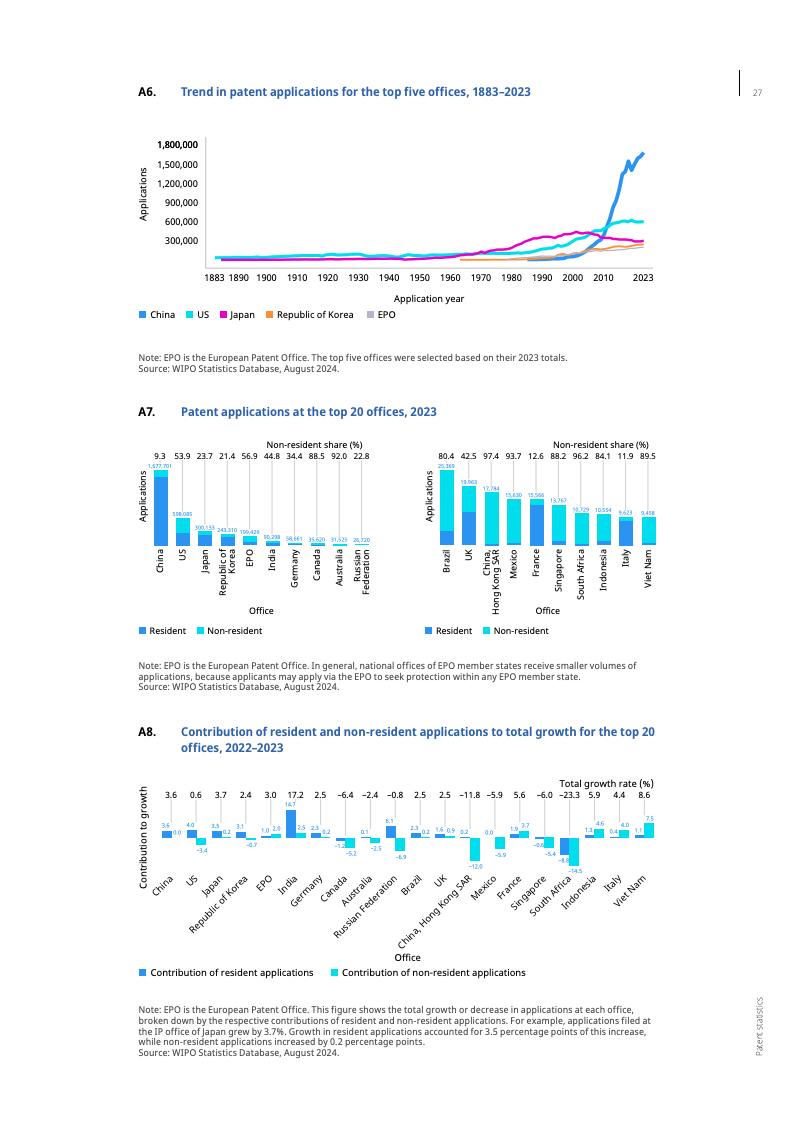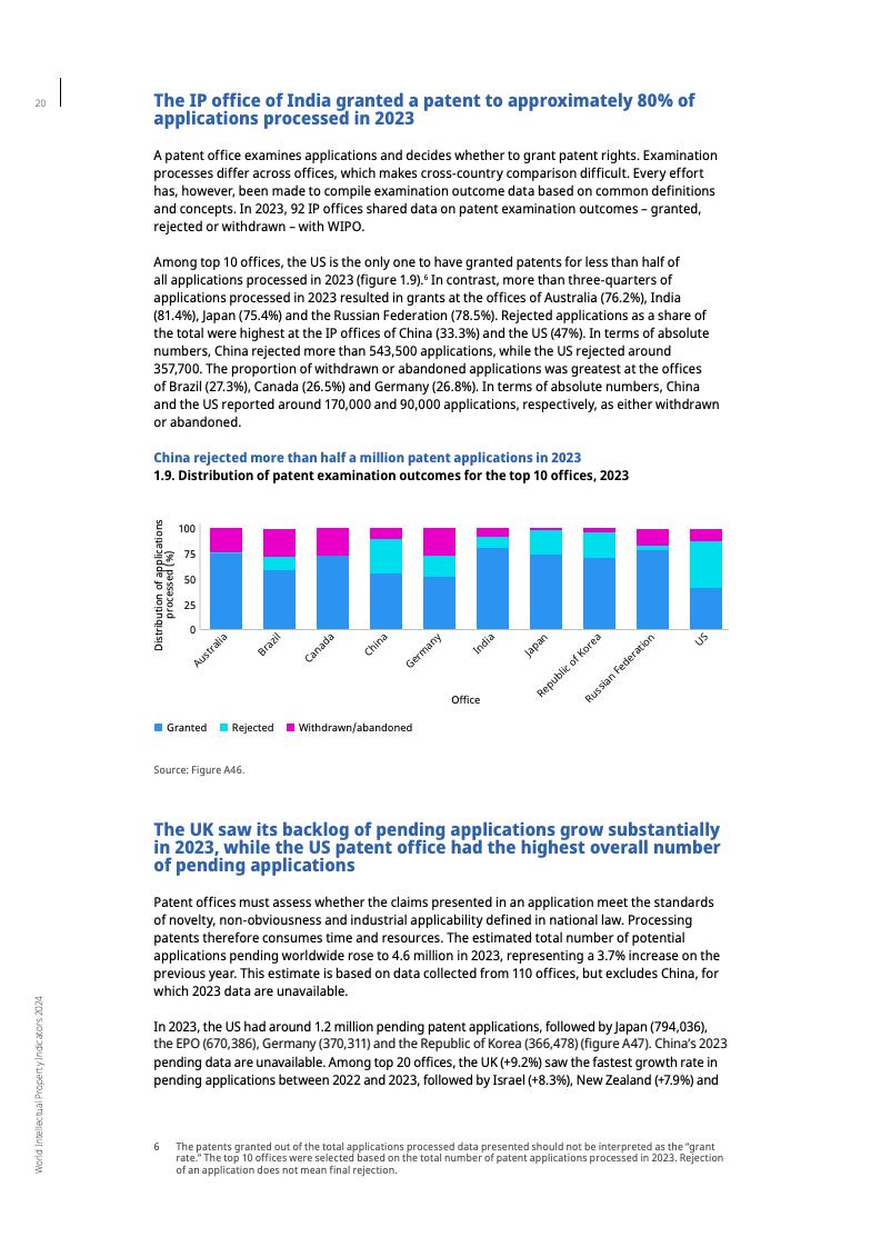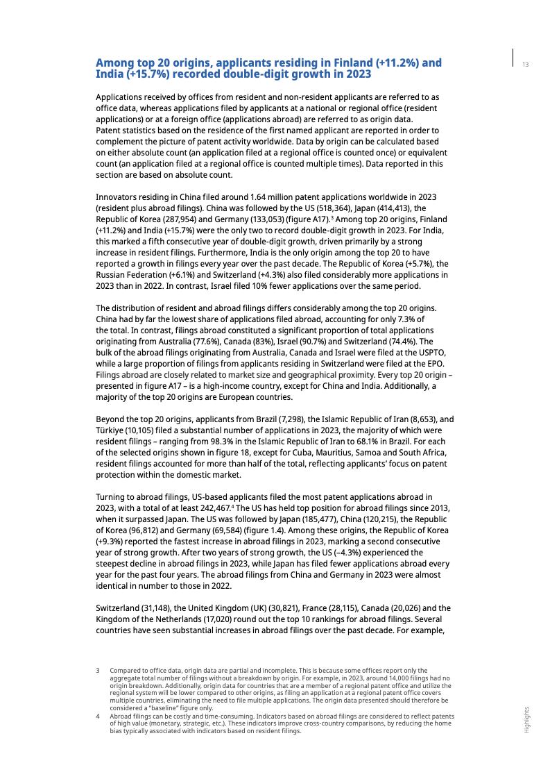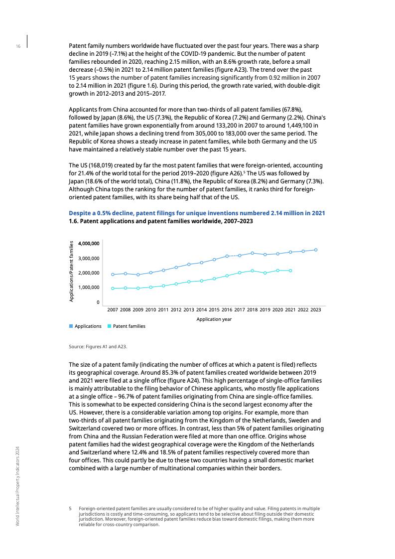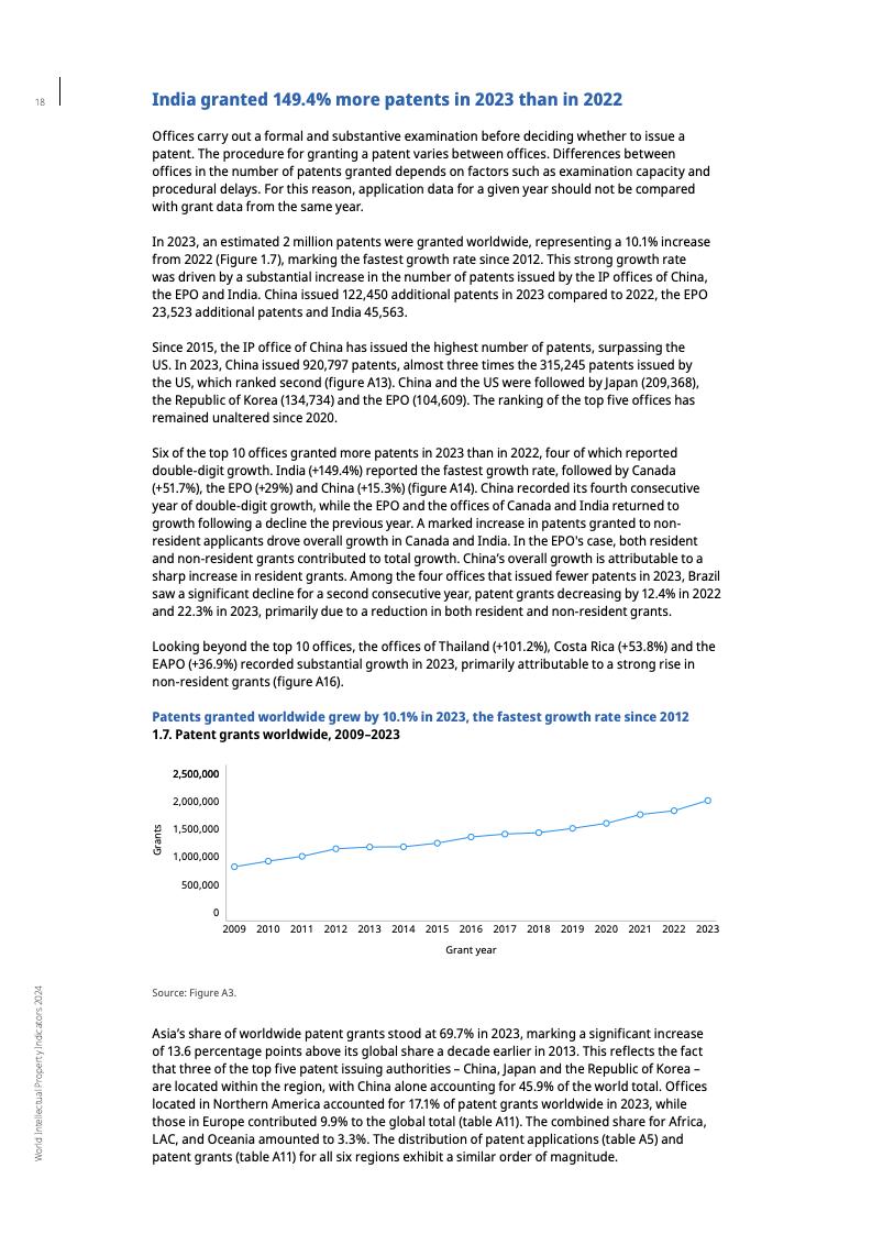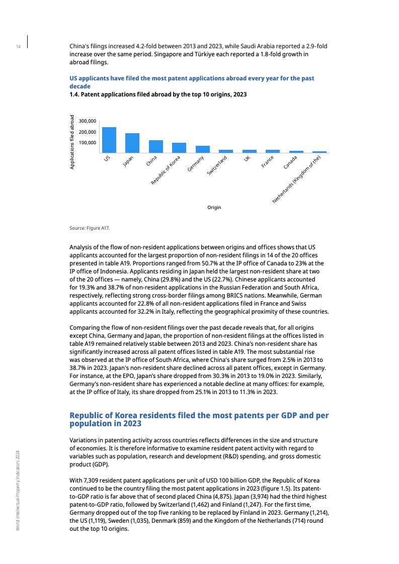 中国(164万件)、美国(518,364件)、日本(414,413件)、大韩民国(287,954件)和德国(133,053件)是全球专利申请量最多的国家。印度(64,480件)的专利申请量增长了15.7%,排名上升一位至第六位,主要由印度经济快速增长支持下居民专利申请量大幅增加所推动。