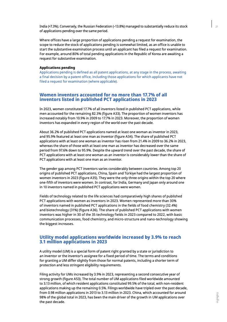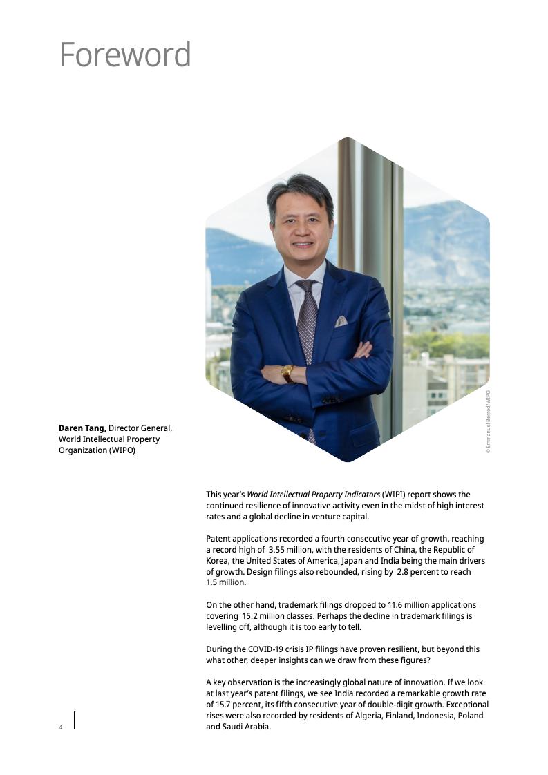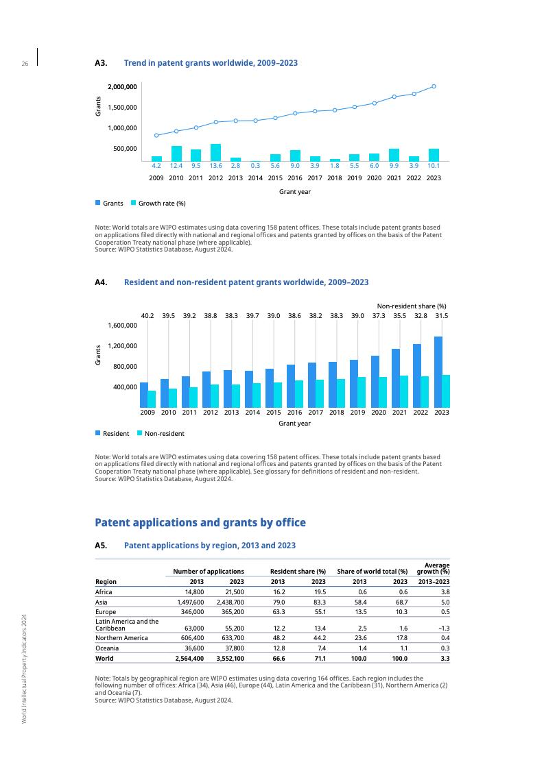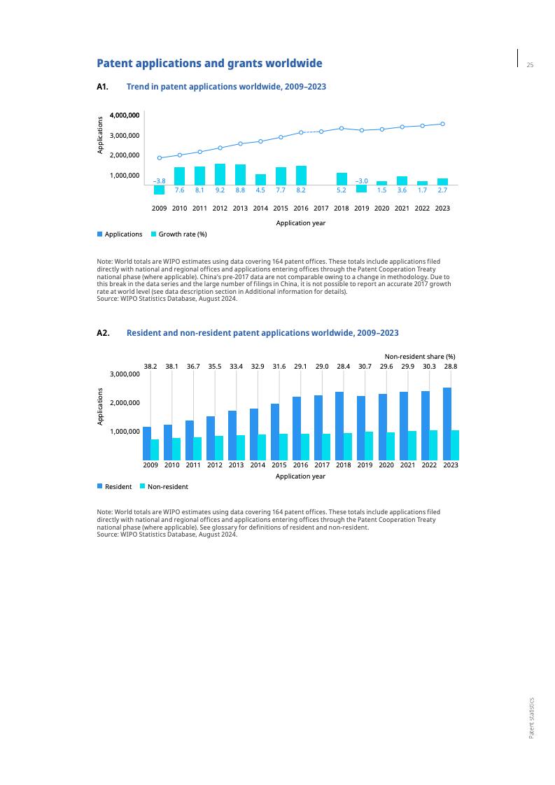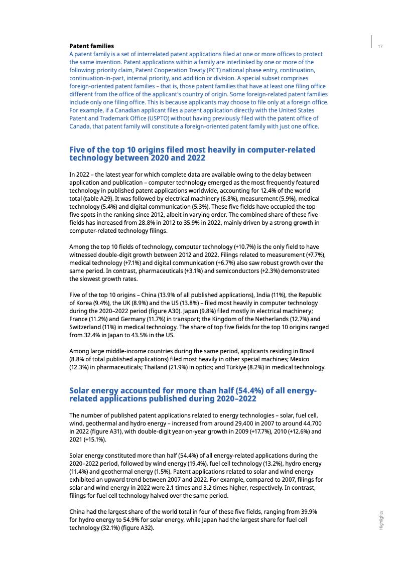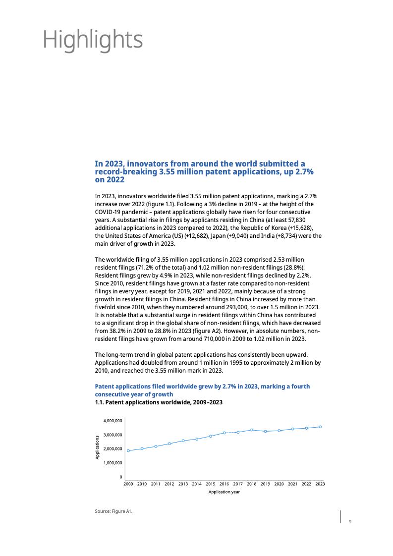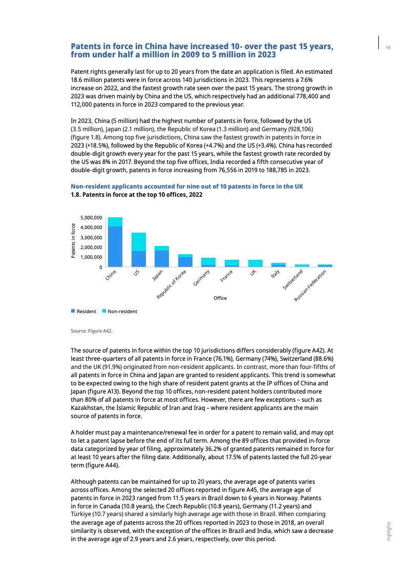 中国(164万件)、美国(518,364件)、日本(414,413件)、大韩民国(287,954件)和德国(133,053件)是全球专利申请量最多的国家。印度(64,480件)的专利申请量增长了15.7%,排名上升一位至第六位,主要由印度经济快速增长支持下居民专利申请量大幅增加所推动。
