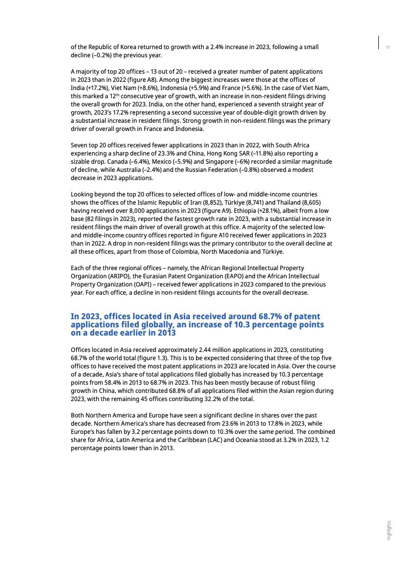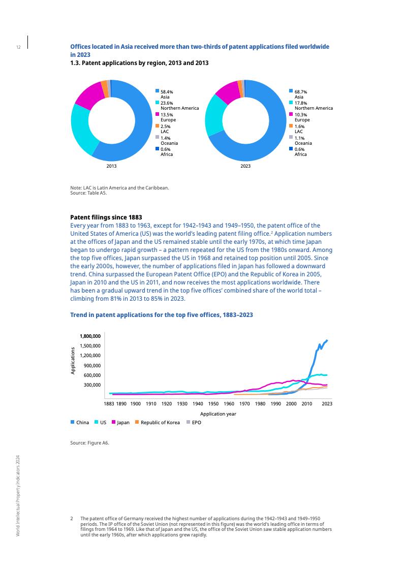 2023年,亚洲各局的专利、商标和工业品外观设计申请活动继续保持长期以来的趋势,分别占全球申请量的68.7%、66.7%和69%。在亚洲区域内,知识产权申请高度集中,中国、日本和大韩民国的主管局合计去年在亚洲的专利、商标和工业品外观设计申请活动中分别占91.1%、77.0%和87.2%。
