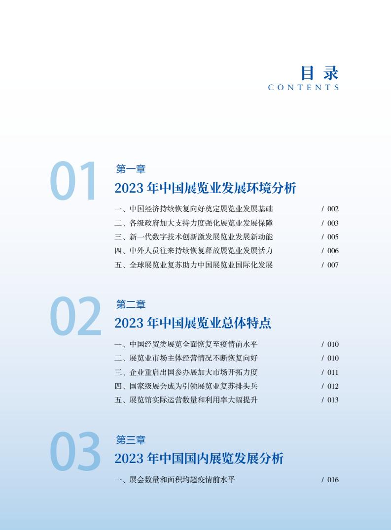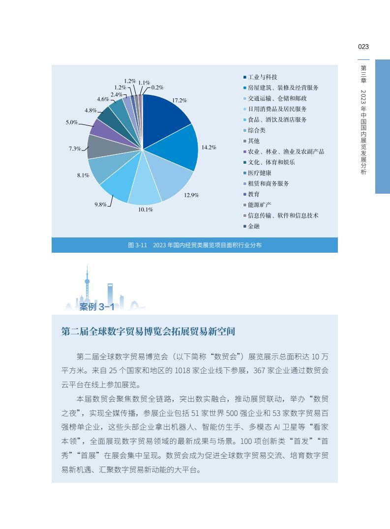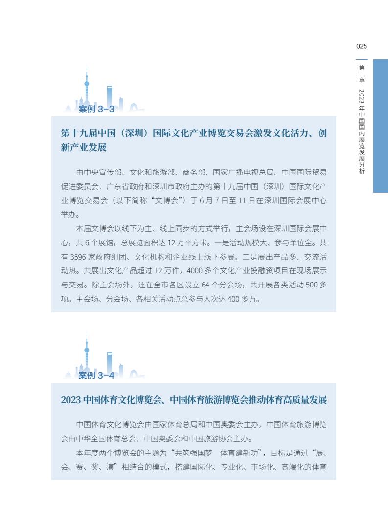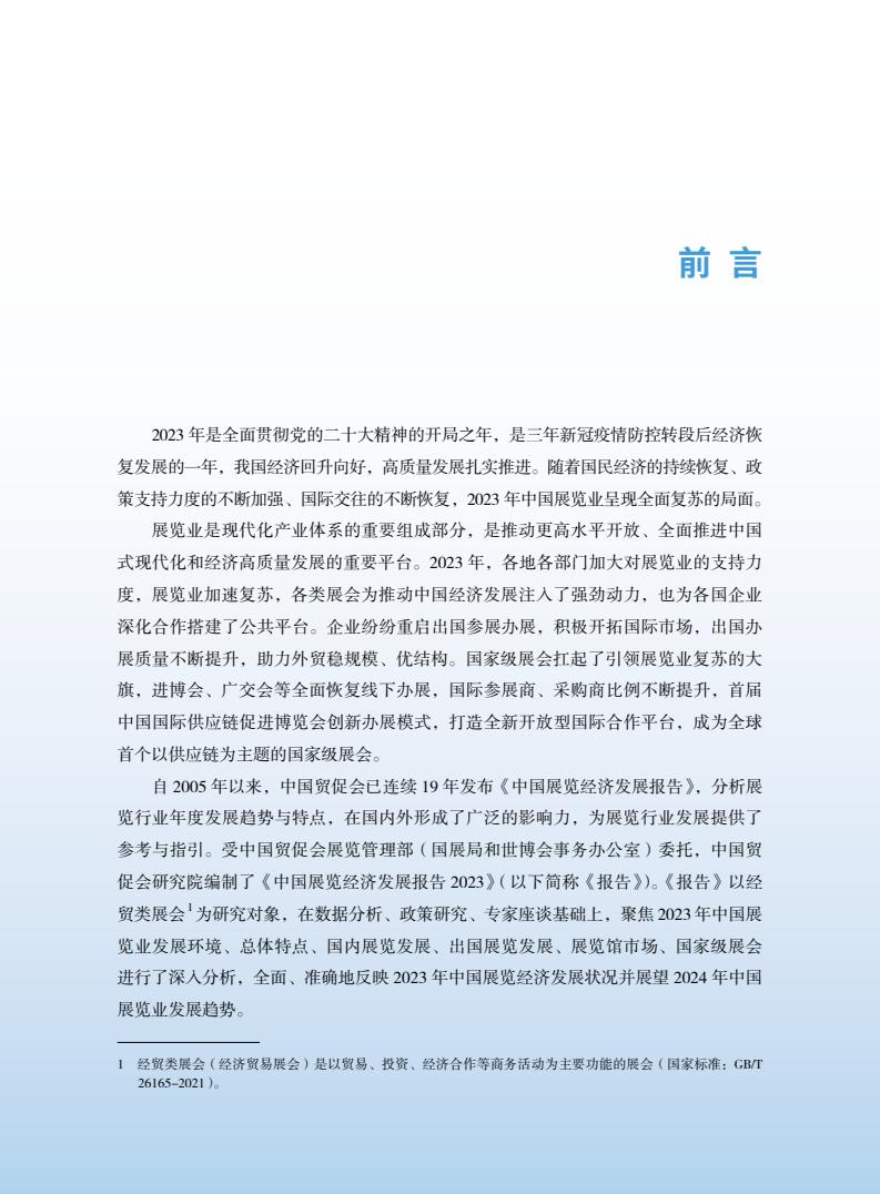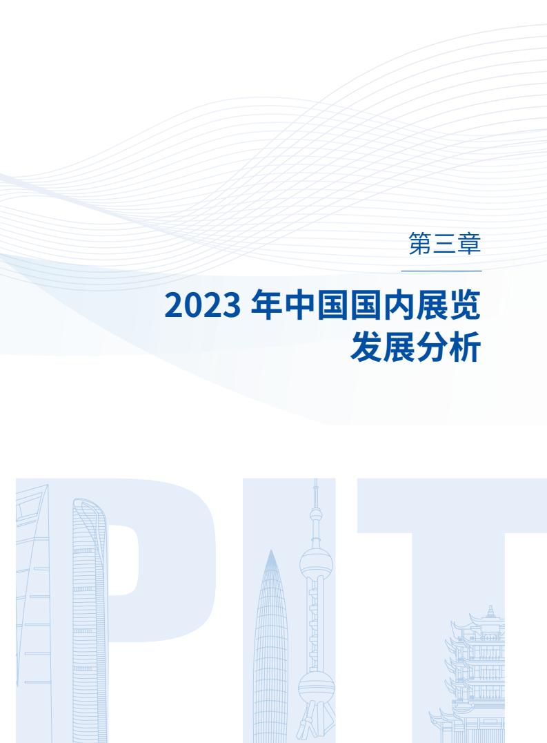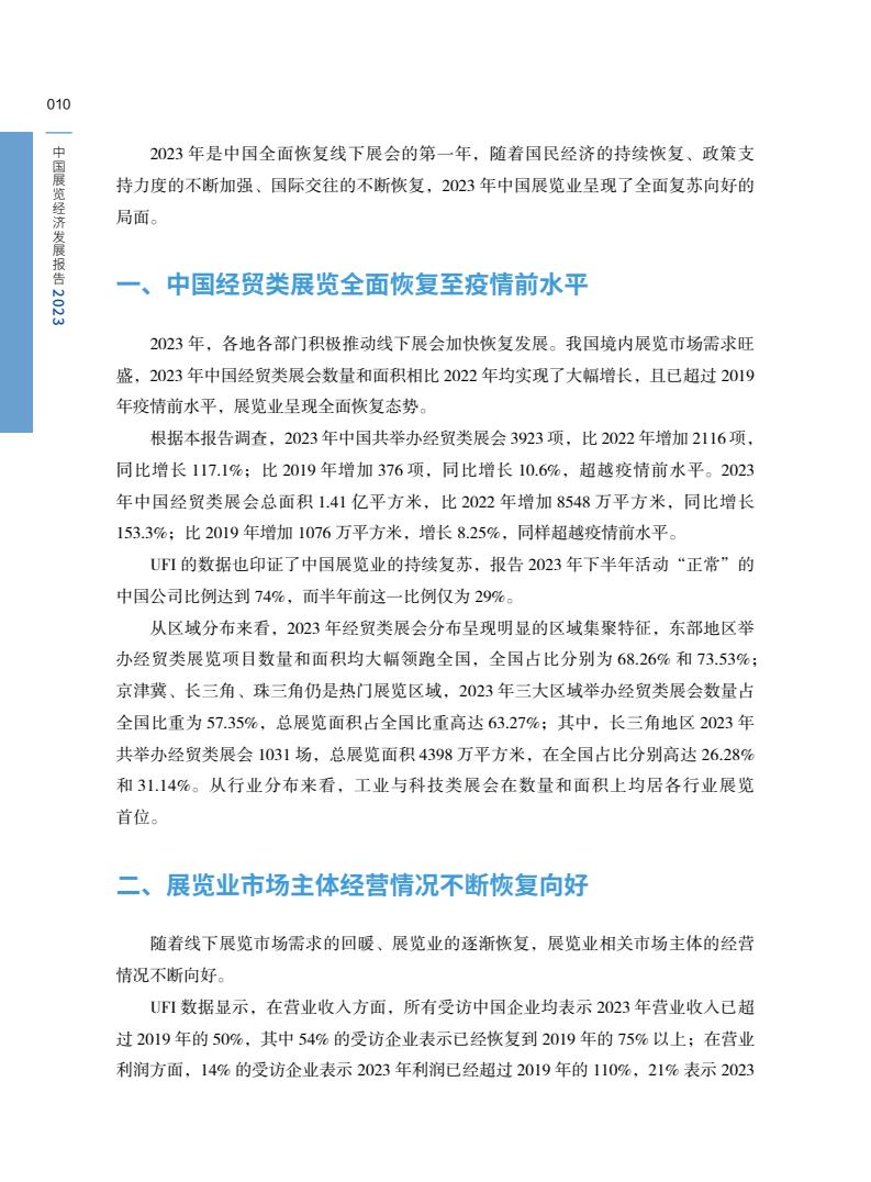 2023年,各地各部门积极推动线下展会加快恢复发展。我国境内展览市场需求旺盛,2023年中国经贸类展会数量和面积相比 2022年均实现了大幅增长,且已超过2019 年疫情前水平,展览业星现全面恢复态势。