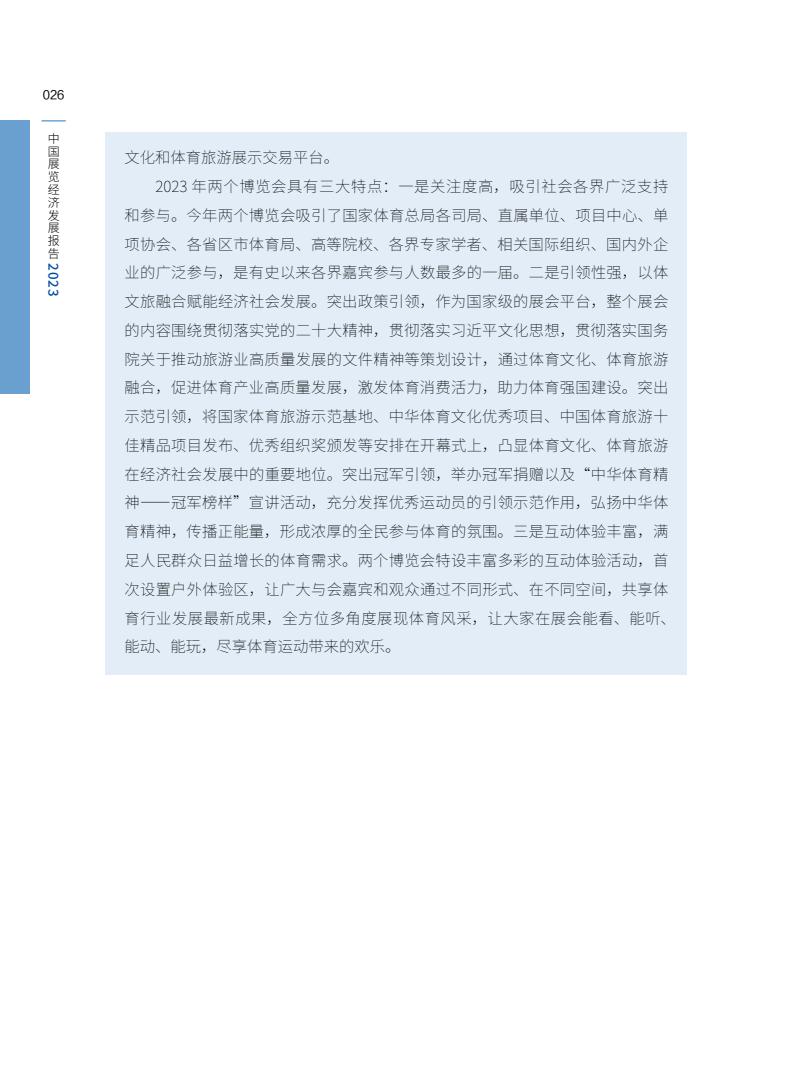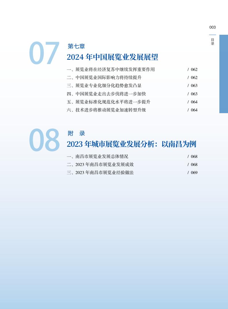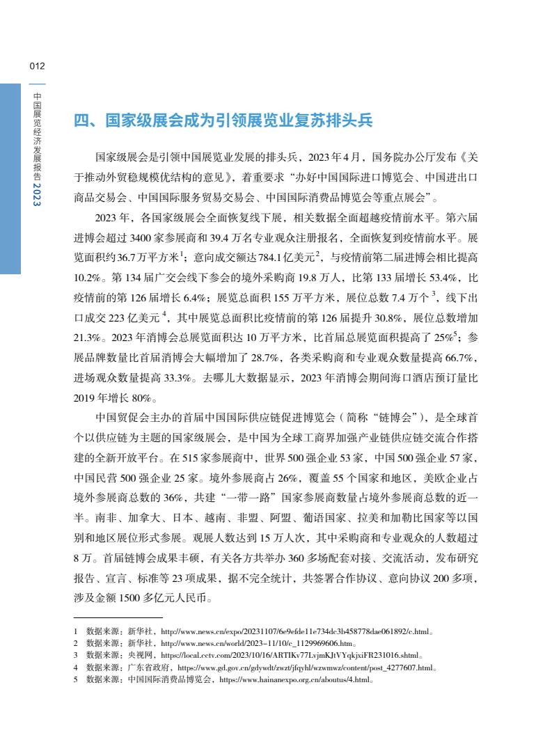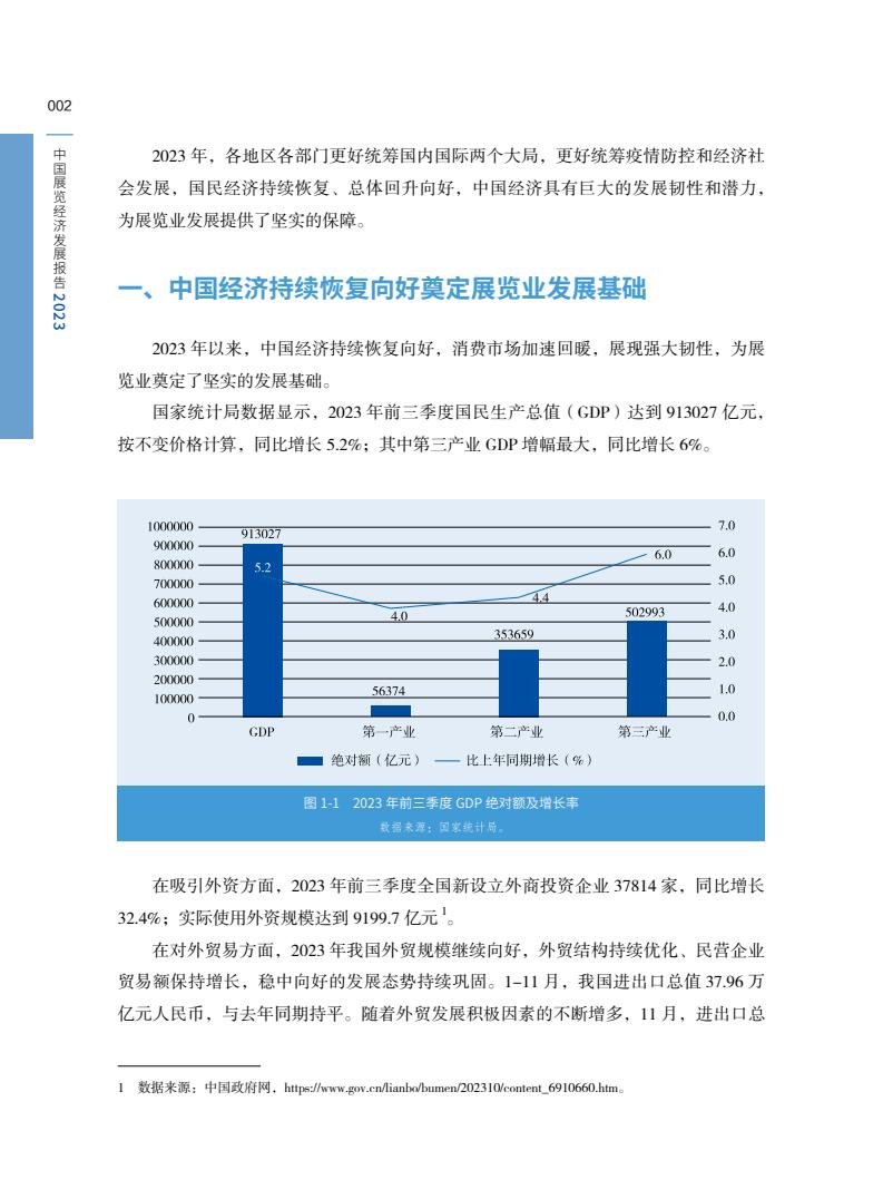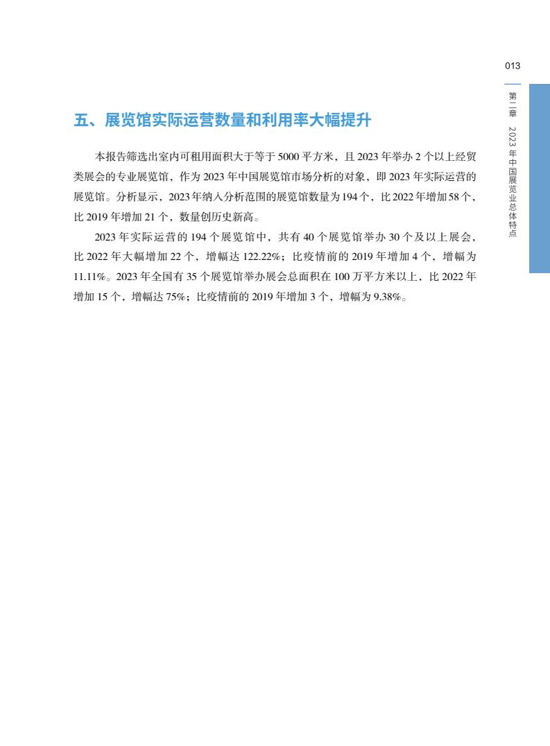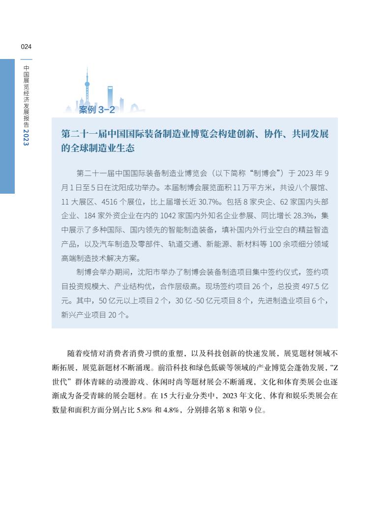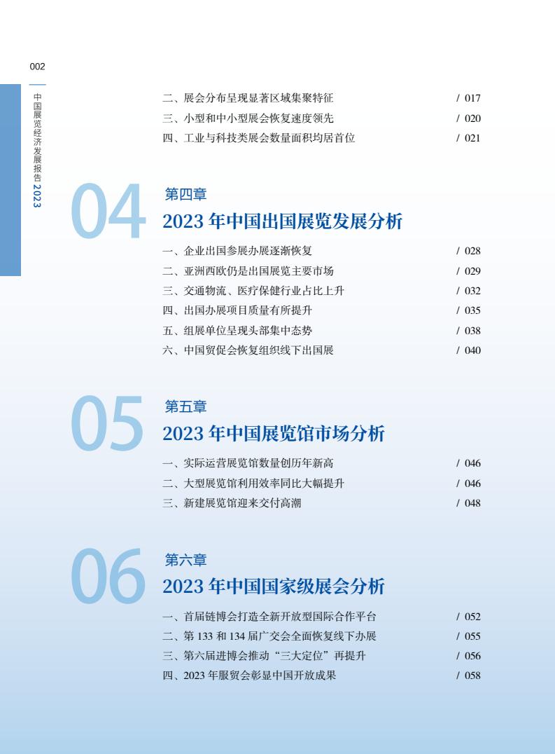 2023年,各地各部门积极推动线下展会加快恢复发展。我国境内展览市场需求旺盛,2023年中国经贸类展会数量和面积相比 2022年均实现了大幅增长,且已超过2019 年疫情前水平,展览业星现全面恢复态势。