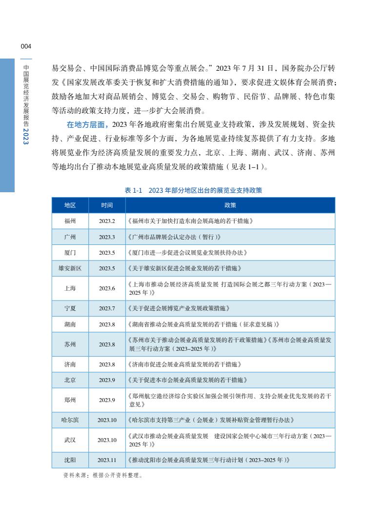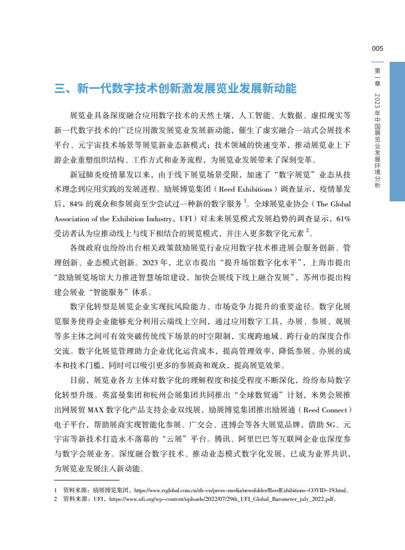 2020年以来,全球展览业遭受了较大冲击,随着世界逐步远离疫情困扰,全球展览业已经进入了复苏通道。2023年7月,UFI 发布《全球展览行业晴雨表》,预计2023 年全球展览业收人将平均达到2019年水平的97%。2023年上半年,79%的公司报告称其活动“正常”,而下半年大部分月份这一比例增至近90%。