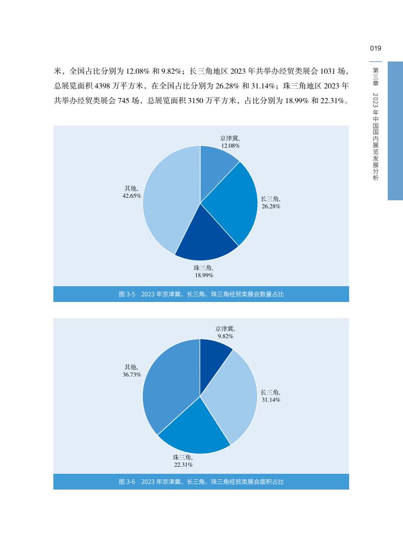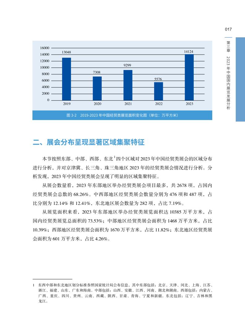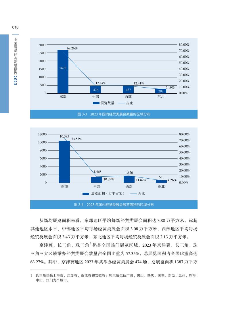 从区域分布来看,2023年经贸类展会分布呈现明显的区域集聚特征,东部地区举办经贸类展览项目数量和面积均大幅领跑全国,全国占比分别为 68.26% 和 73.53%;