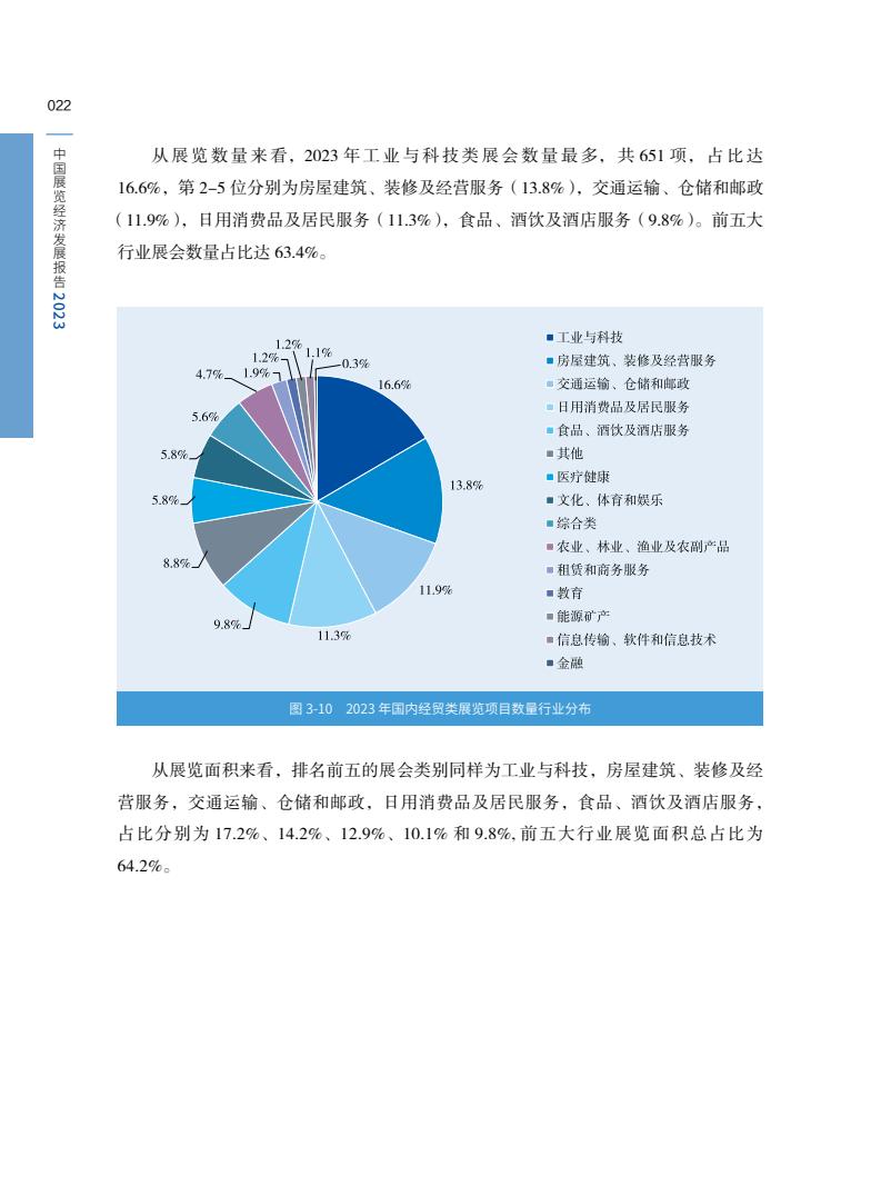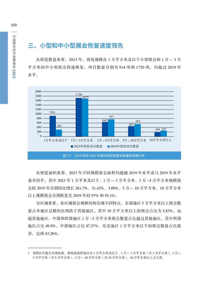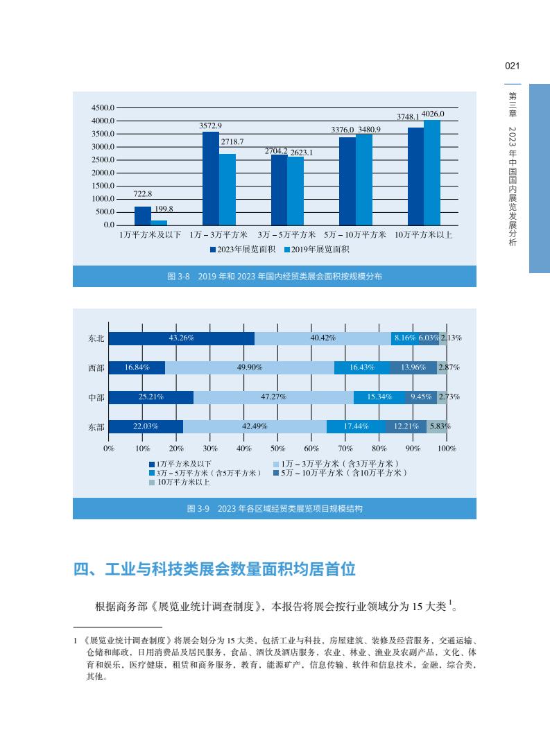 根据本报告调查,2023年中国共举办经贸类展会3923项,比2022年增加2116项, 同比增长 117.1%;比2019年增加376项,同比增长 10.6%,超越疫情前水平。2023 年中国经贸类展会总面积1.41亿平方米,比2022年增加8548万平方米,同比增长 153.3%;比2019年增加1076万平方米,增长8.25%,同样超越疫情前水平。