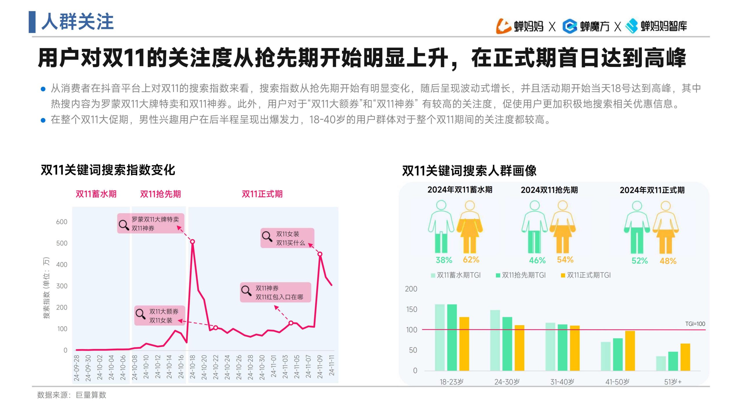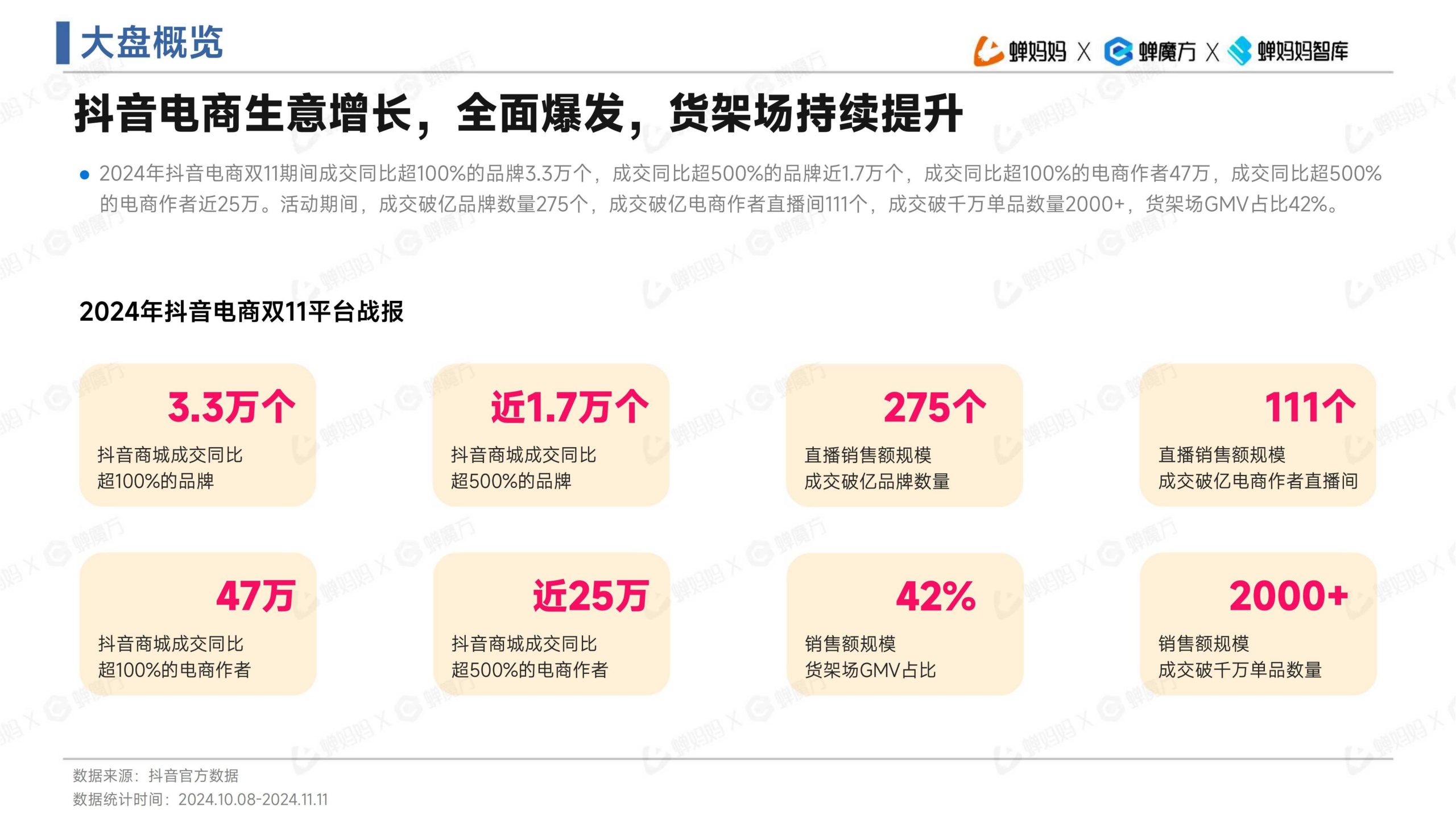 销售数据亮眼:2024年双11期间,抖音电商成交同比大幅增长,众多品牌和电商作者销售额显著提升,货架场GMV占比达42%。
