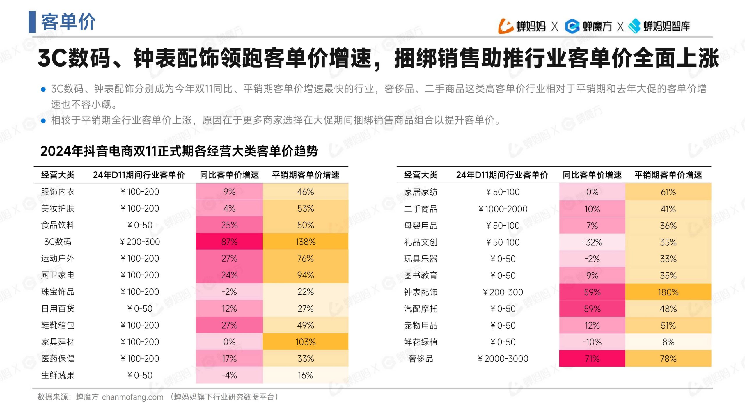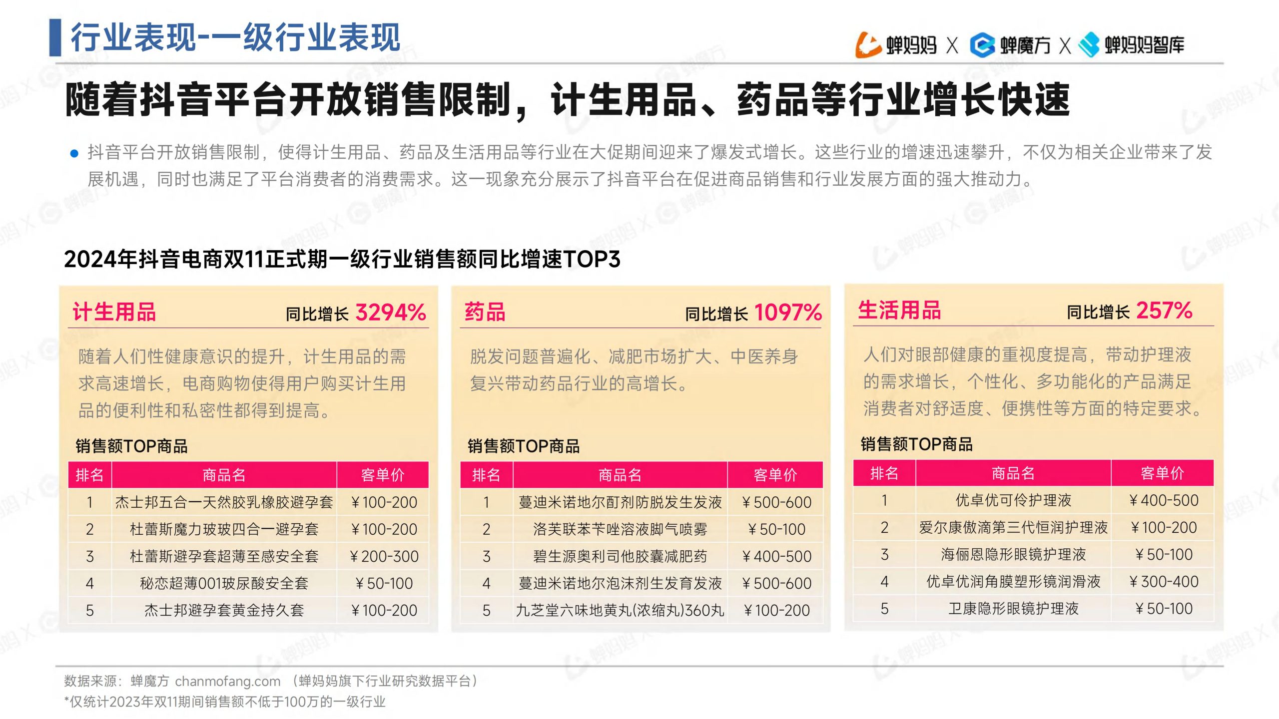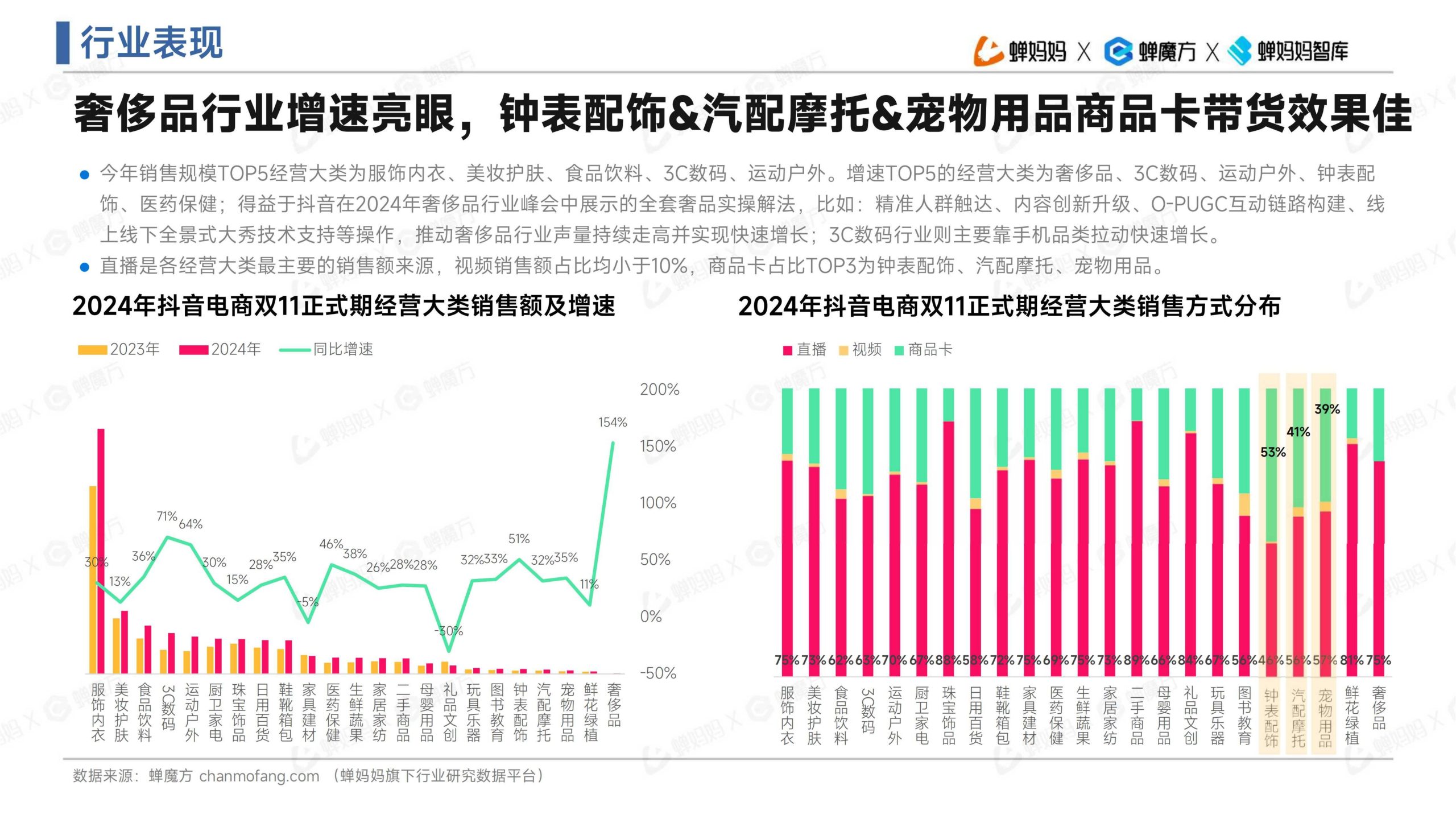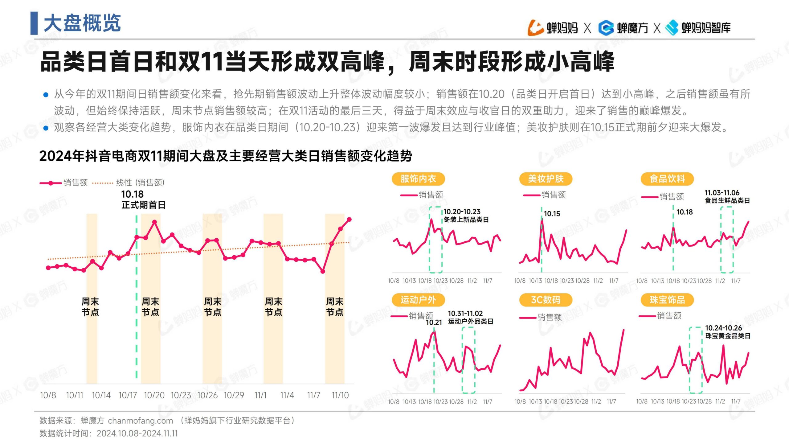 销售节奏与品类表现:品类日首日和双11当天形成销售高峰,周末亦有小高峰。服饰内衣、美妆护肤等品类表现突出,奢侈品行业增速领先,部分行业如计生用品、药品增长快速。
