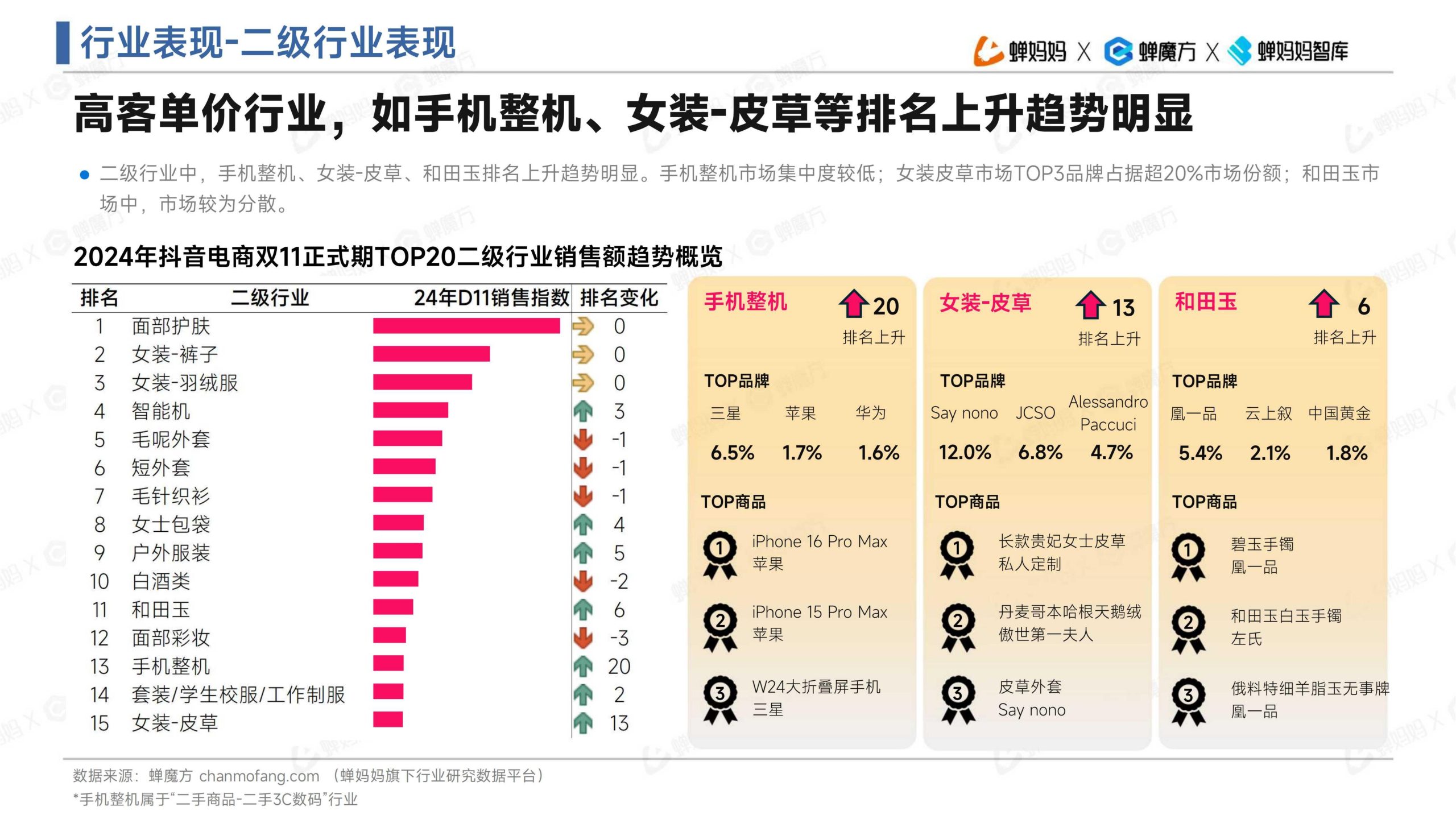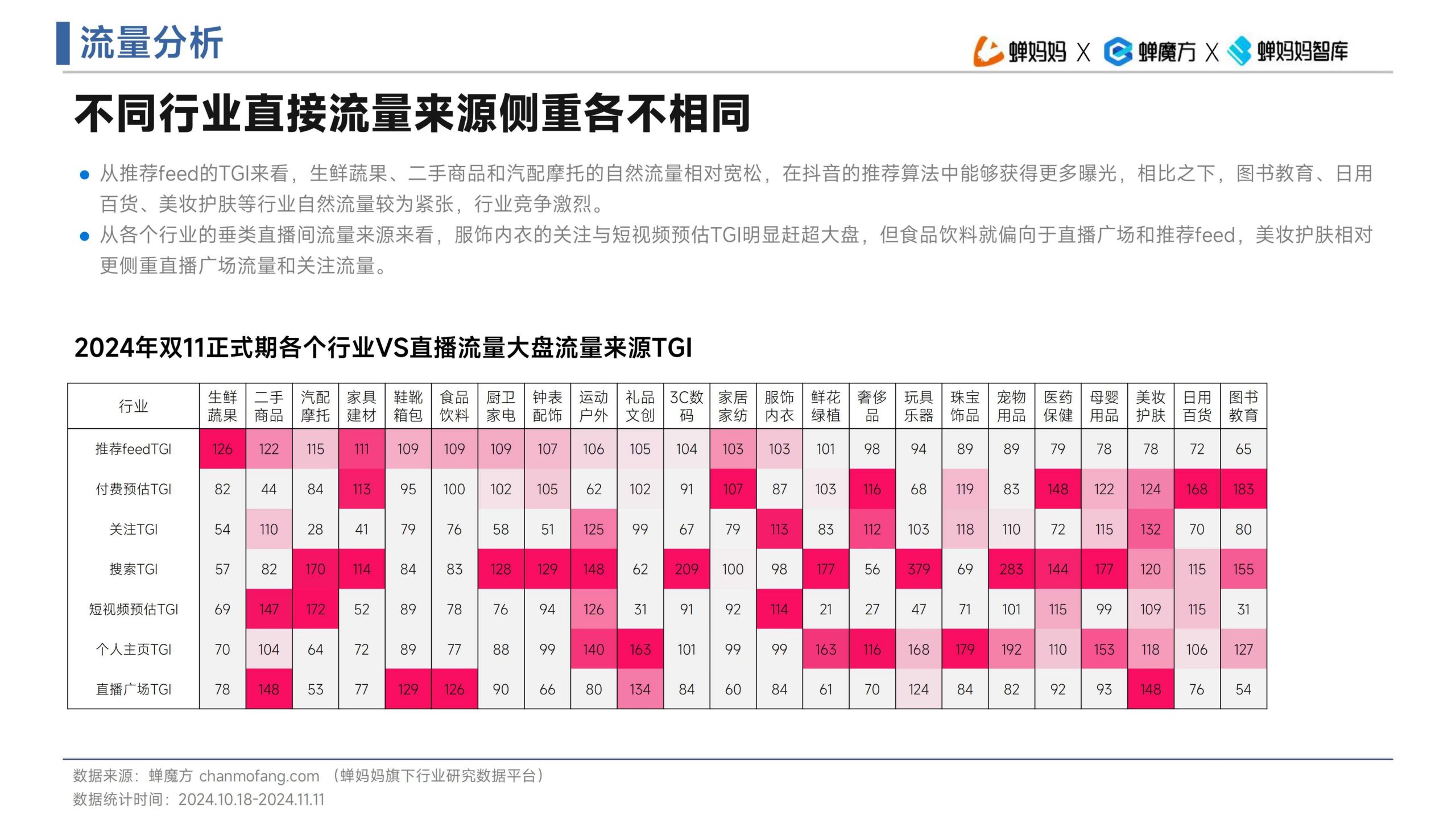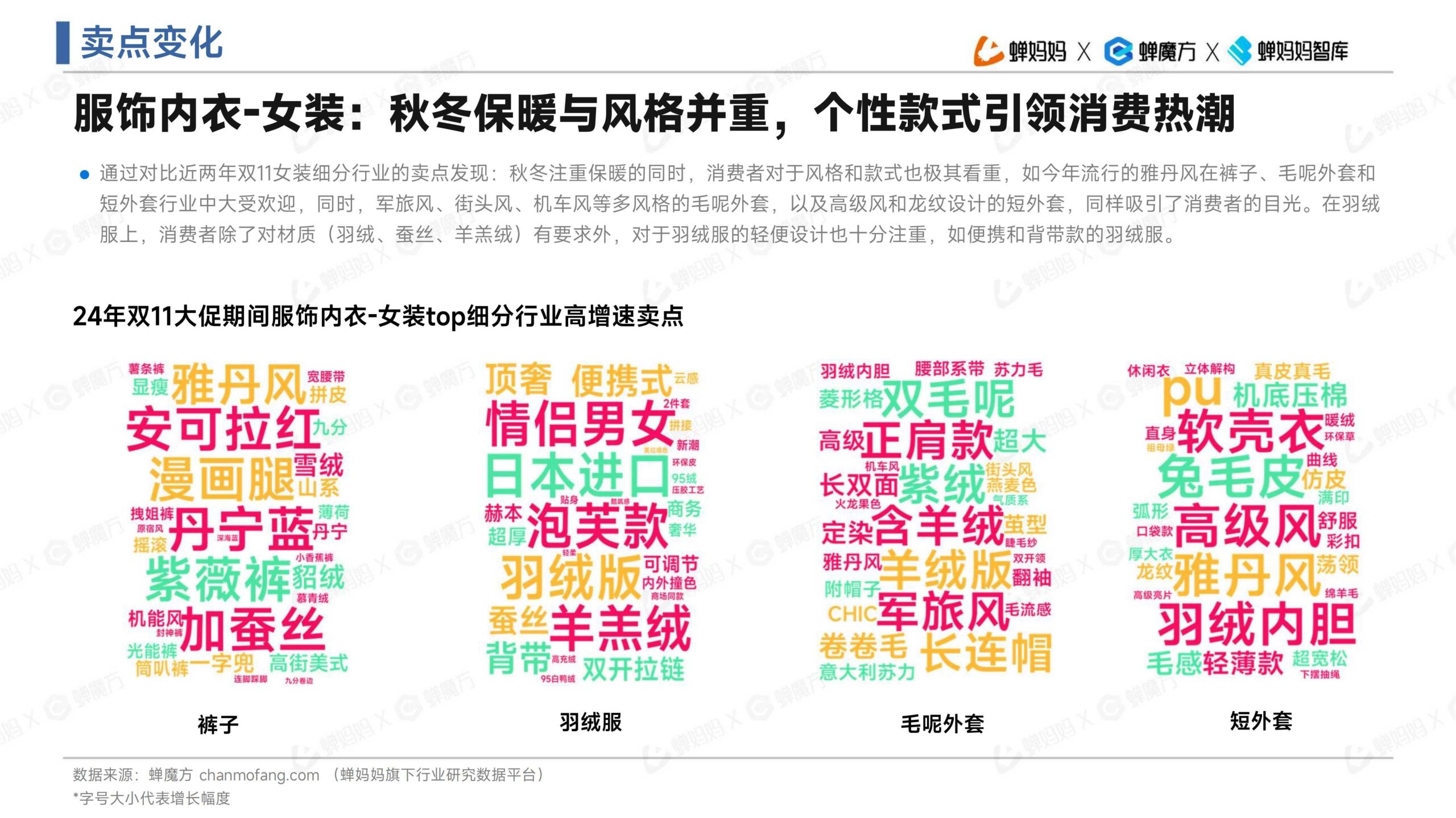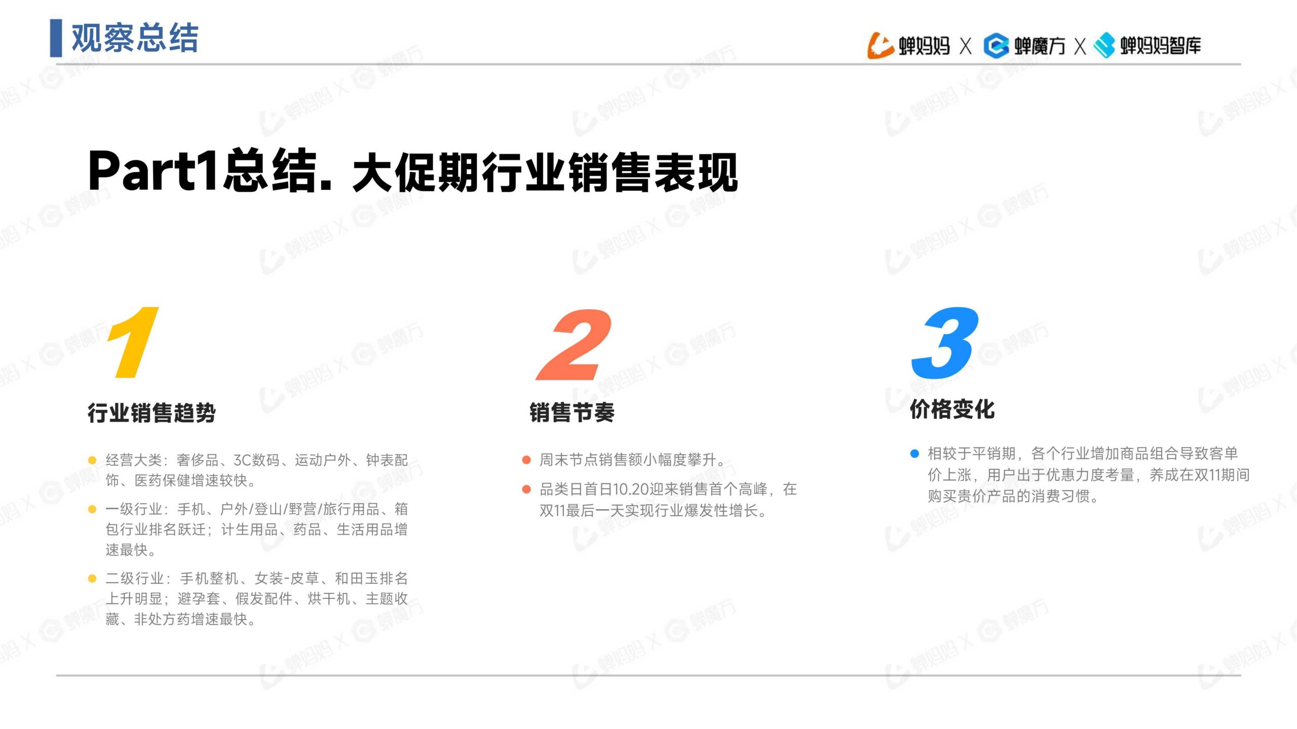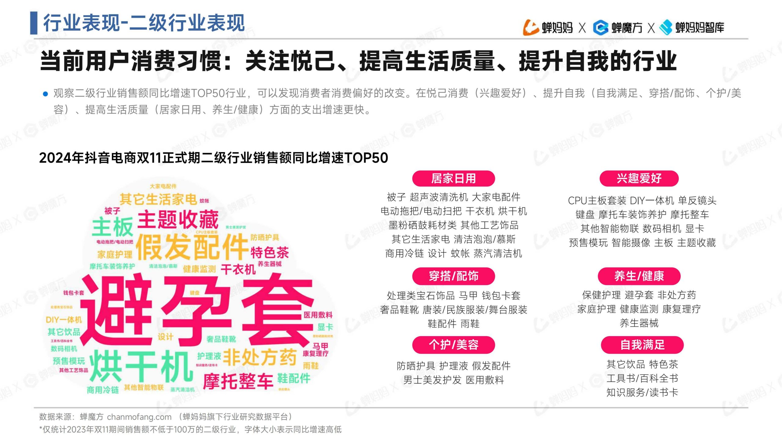 销售节奏与品类表现:品类日首日和双11当天形成销售高峰,周末亦有小高峰。服饰内衣、美妆护肤等品类表现突出,奢侈品行业增速领先,部分行业如计生用品、药品增长快速。