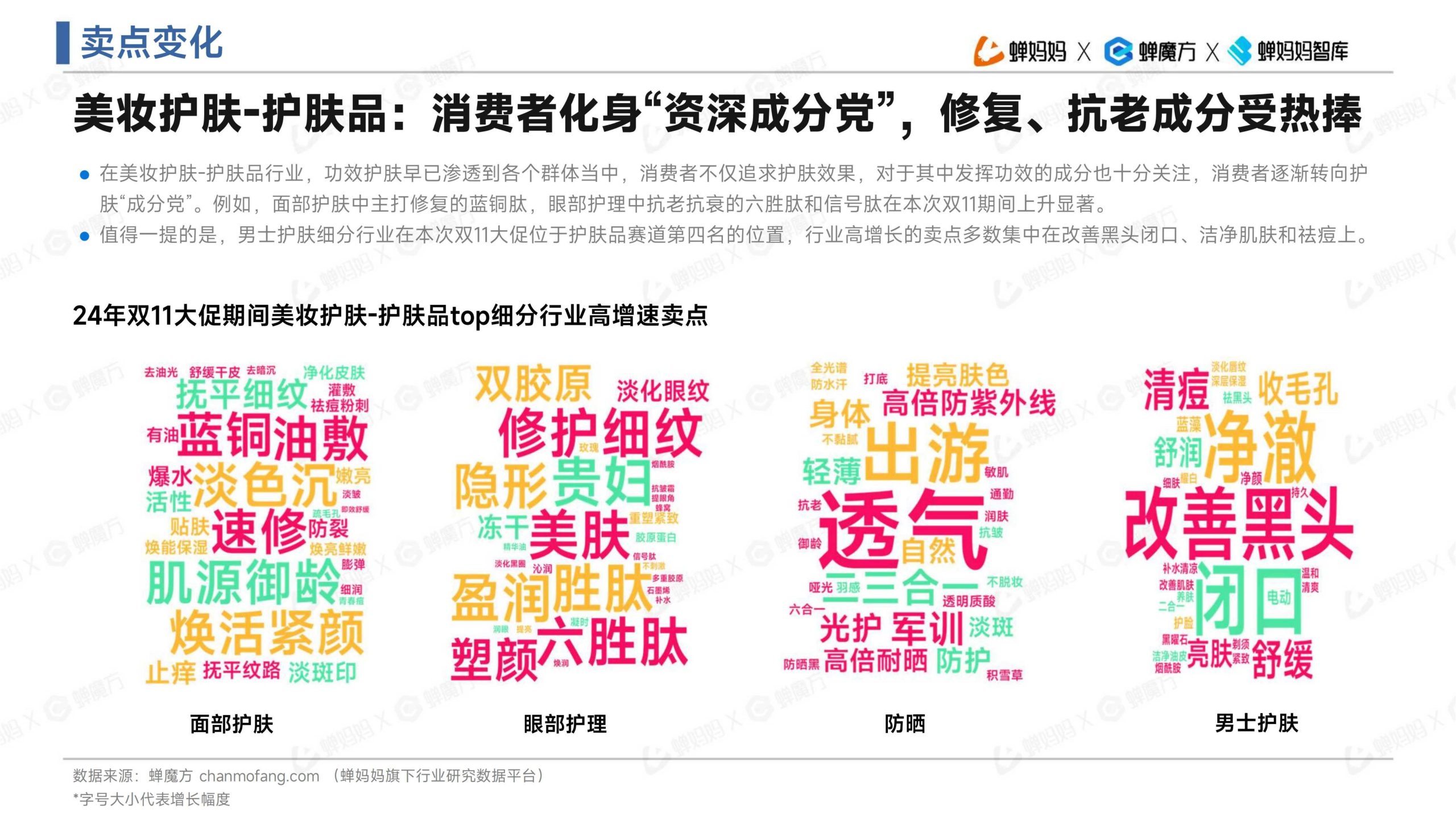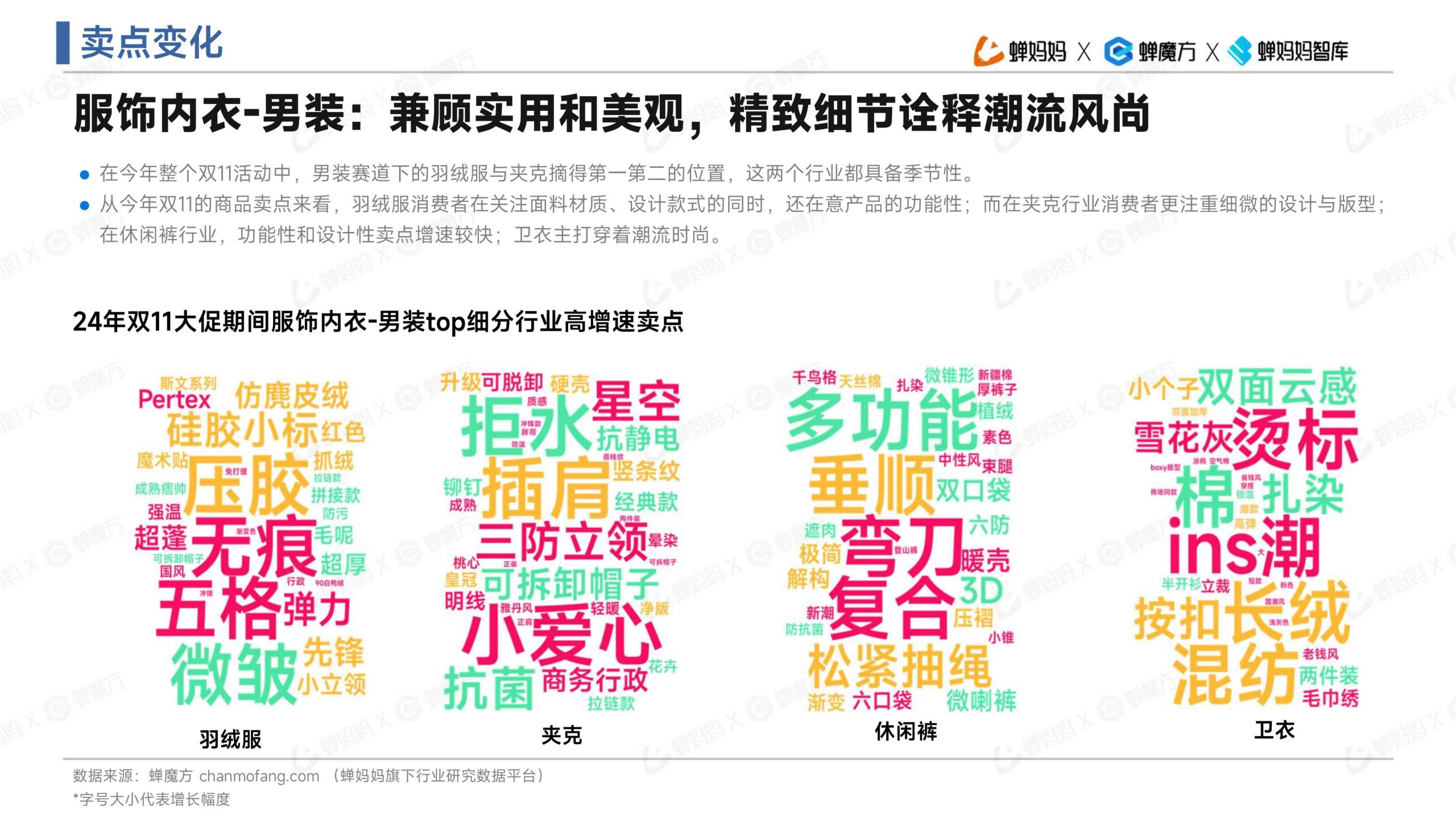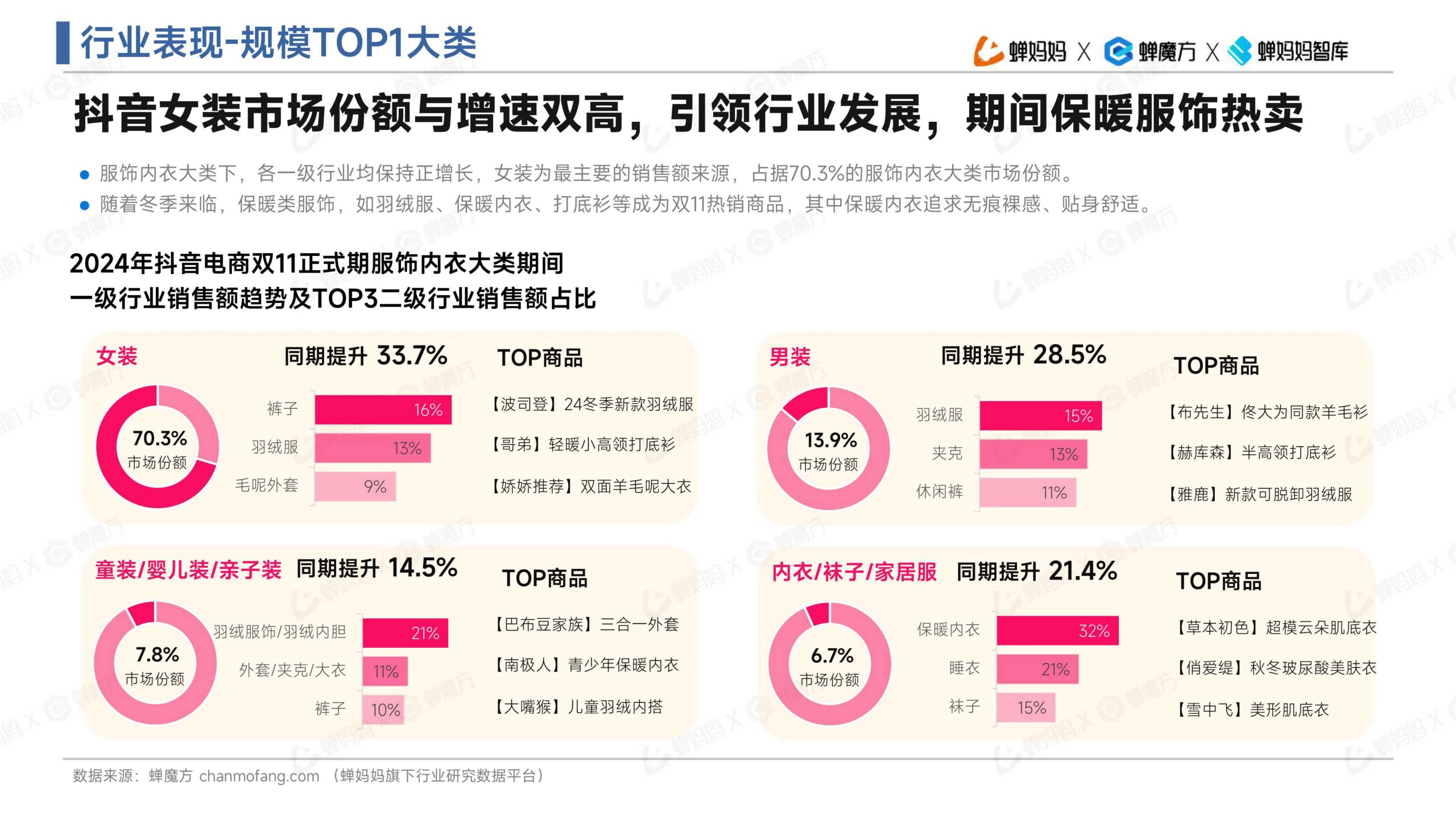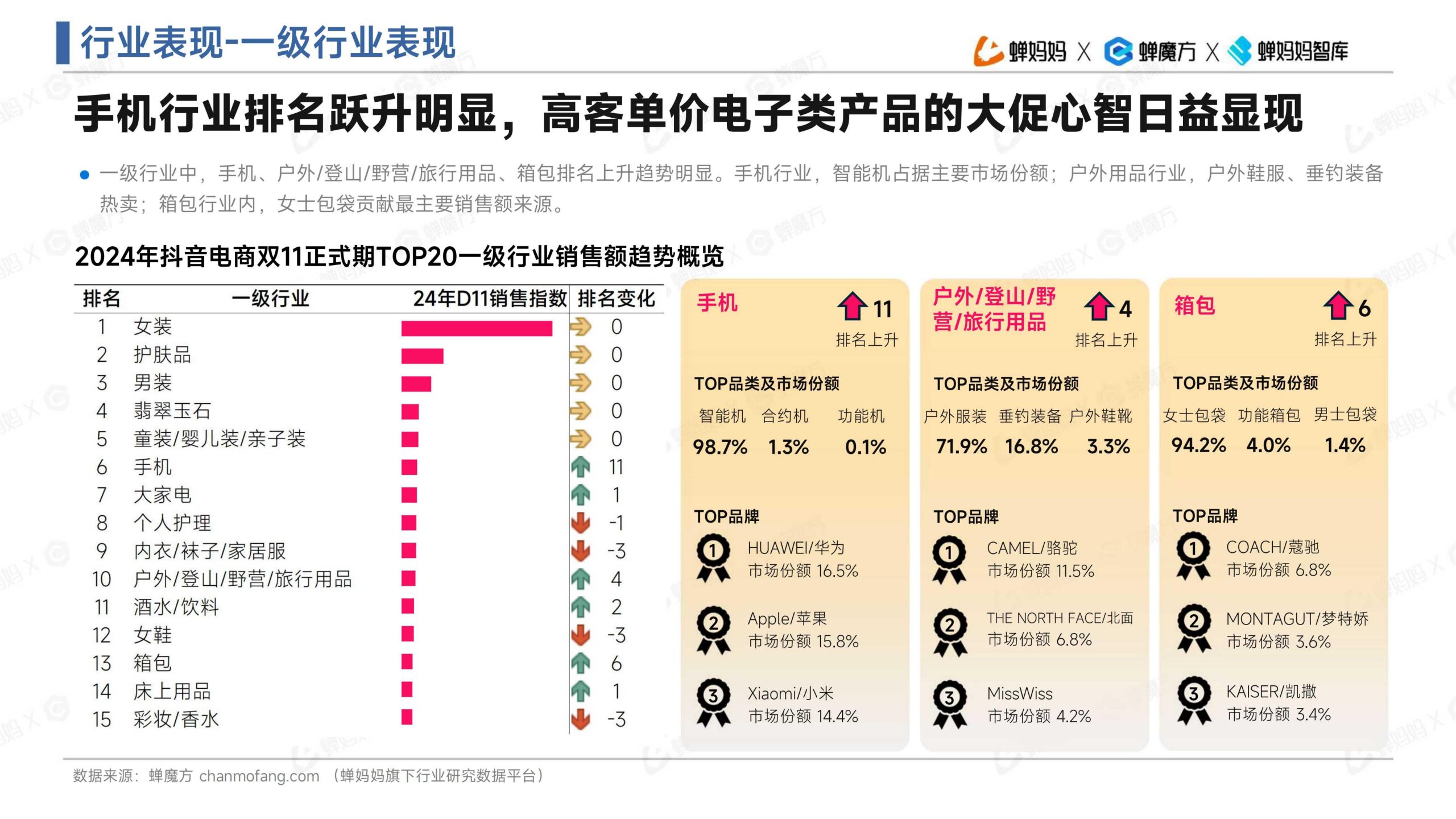 销售节奏与品类表现:品类日首日和双11当天形成销售高峰,周末亦有小高峰。服饰内衣、美妆护肤等品类表现突出,奢侈品行业增速领先,部分行业如计生用品、药品增长快速。