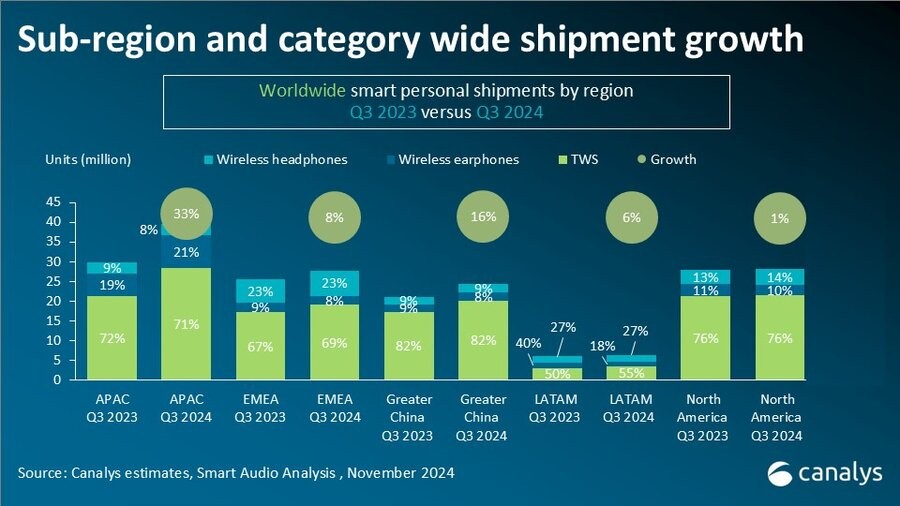 根据Canalys的最新研究,2024年第三季度,全球智能个人音频市场出现了显著反弹,总出货量达到1.26亿部,同比增长15%。这标志着连续第三个季度的增长,从2023年面临的挑战中持续复苏。增长基础广泛,每个主要分区域都有所增长。所有主要产品类别均实现两位数的增长,突显了全球市场的良好前景,新兴的开放式设备和中型供应商为这一积极势头做出了重大贡献。