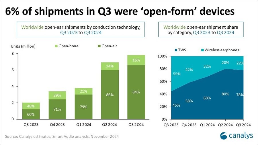 Canalys研究经理Cynthia Chen表示:“随着全球健康和健身趋势的上升,开放式设备在2024年第三季度是一个突出的增长领域。对开放式TWS和无线耳机的需求激增,这类产品的出货量同比增长近两倍,占总市场的6%。开放式无线立体声(OWS)设备是这一增长的关键动力,由专业品牌,如Shokz和Sanag引领。此外,主要供应商也进入了这个细分市场,旨在吸引新的消费者群体。”