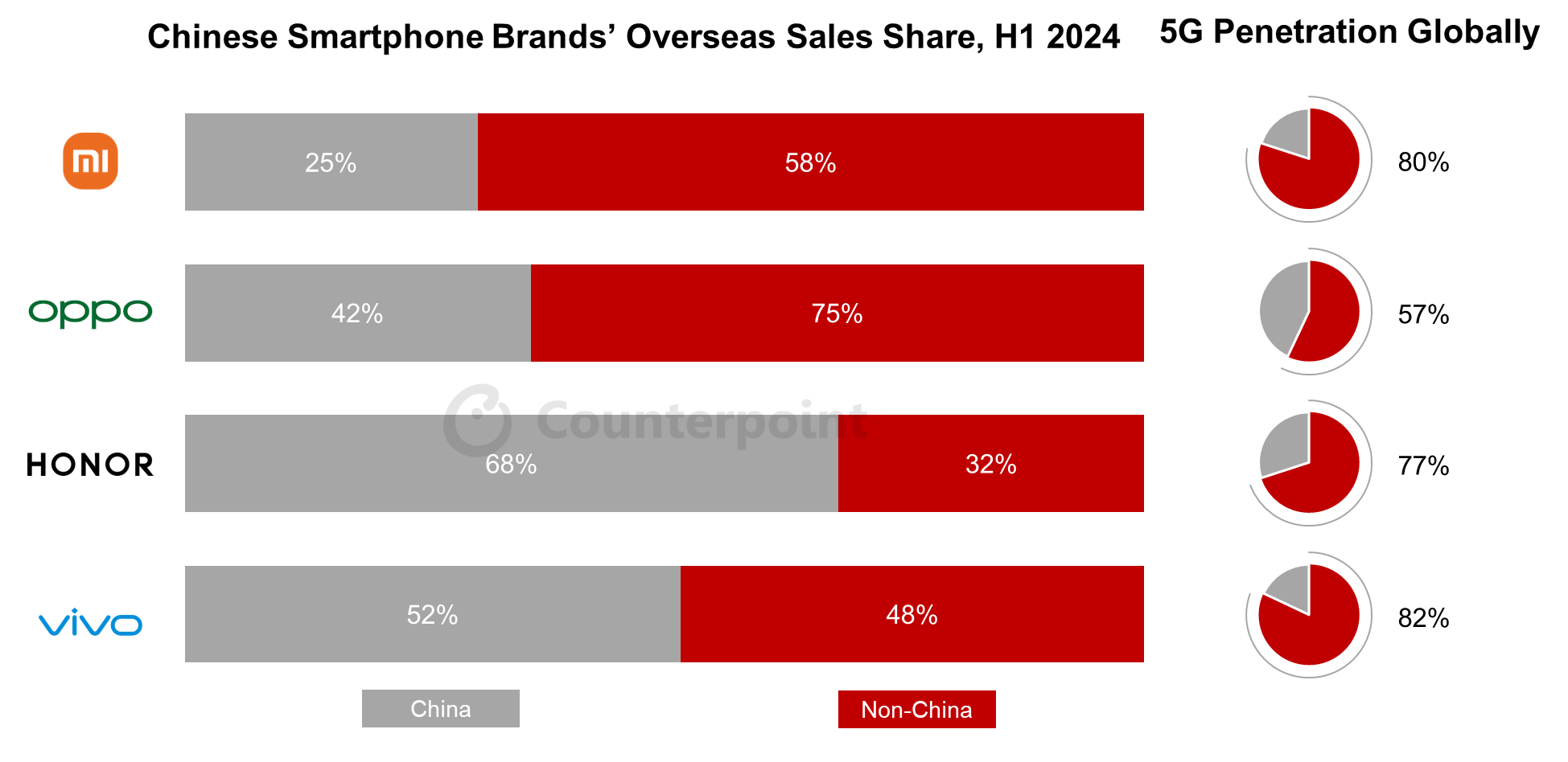 多年来,在高性价比产品和面向大众市场的移动技术普及的推动下,中国安卓品牌在海外表现强劲,尤其是在新兴市场。此外,通过开拓更多的新兴市场,它们对市场波动的抵抗力也越来越强。长期以来,小米和OPPO等公司的海外销售贡献已经超过了国内数据。