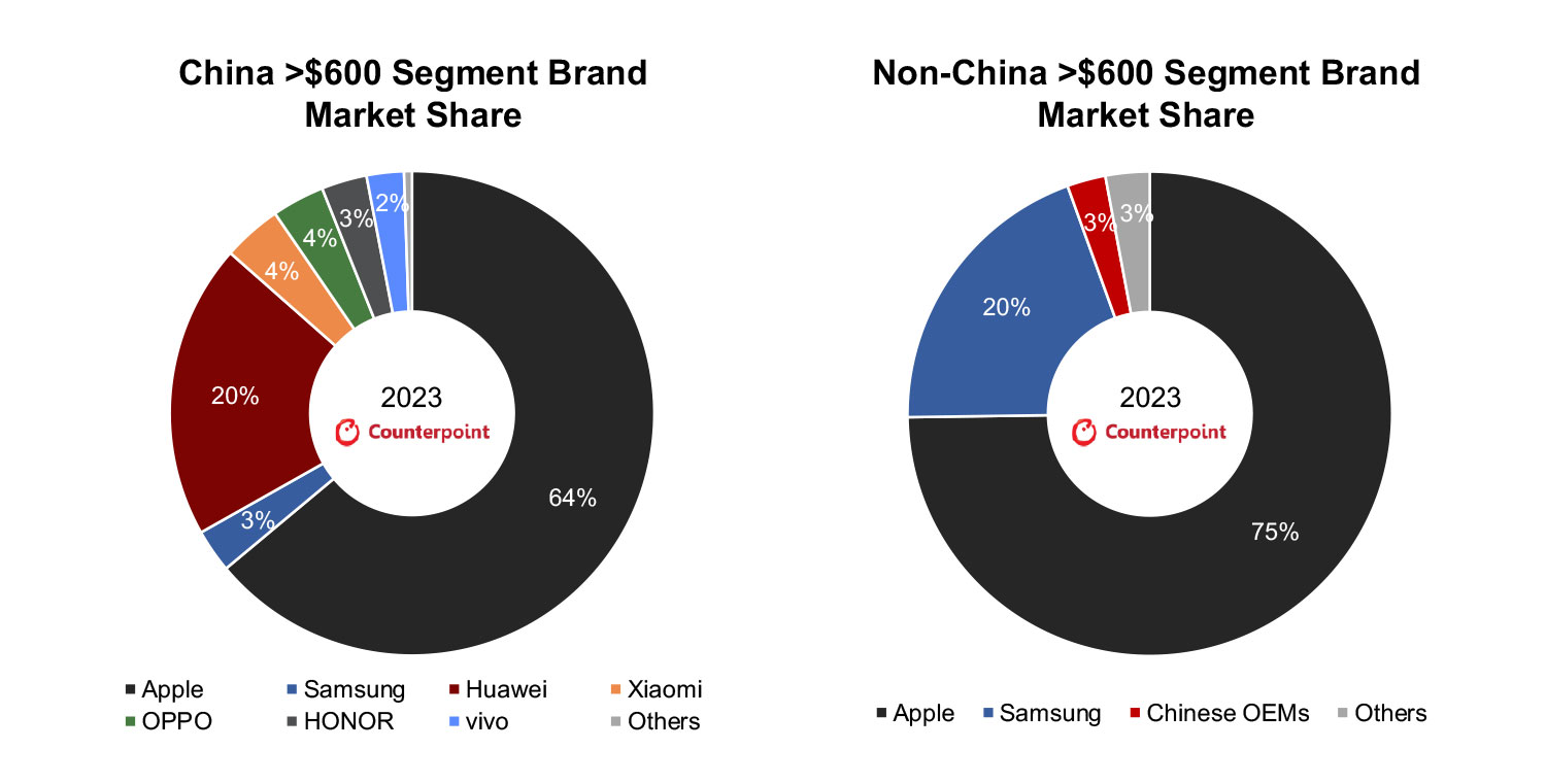 相比之下,苹果和三星在中国以外的高端市场占据主导地位。即使消费者有充足的预算,他们在这两个品牌之间的选择在很大程度上也是有限的。