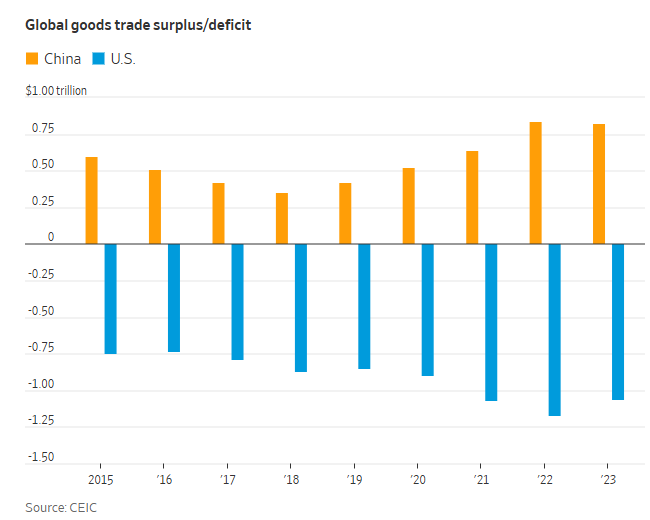 事实上,尽管在特朗普首个任期祭出贸易战后,中国在美国进口中所占的份额已从2017年的22%下降到2023年的约14%,但中美之间不断上升的关税,对于遏制美国在全球贸易中的总体贸易逆差或中国的总体贸易顺差,几乎没有起到任何作用。