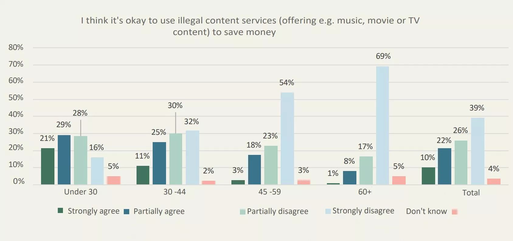 调查发现,在 30 岁以下的参与者中,21% 的人强烈同意,如果官方渠道太贵,从非法渠道获取电影、音乐或电视节目是可以接受的。