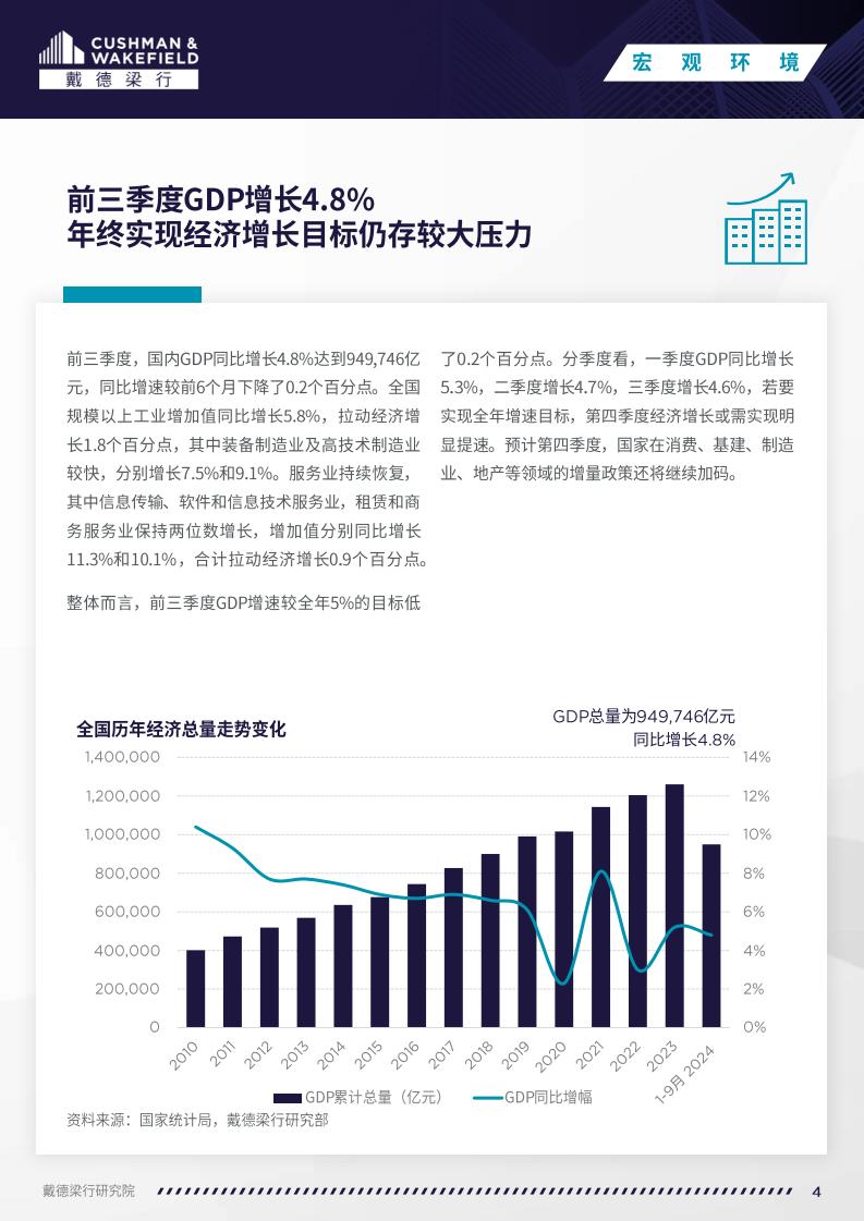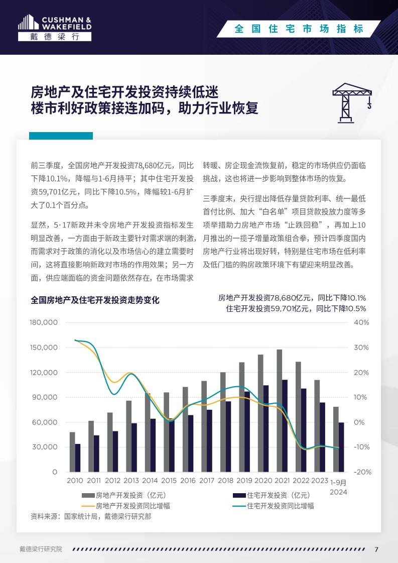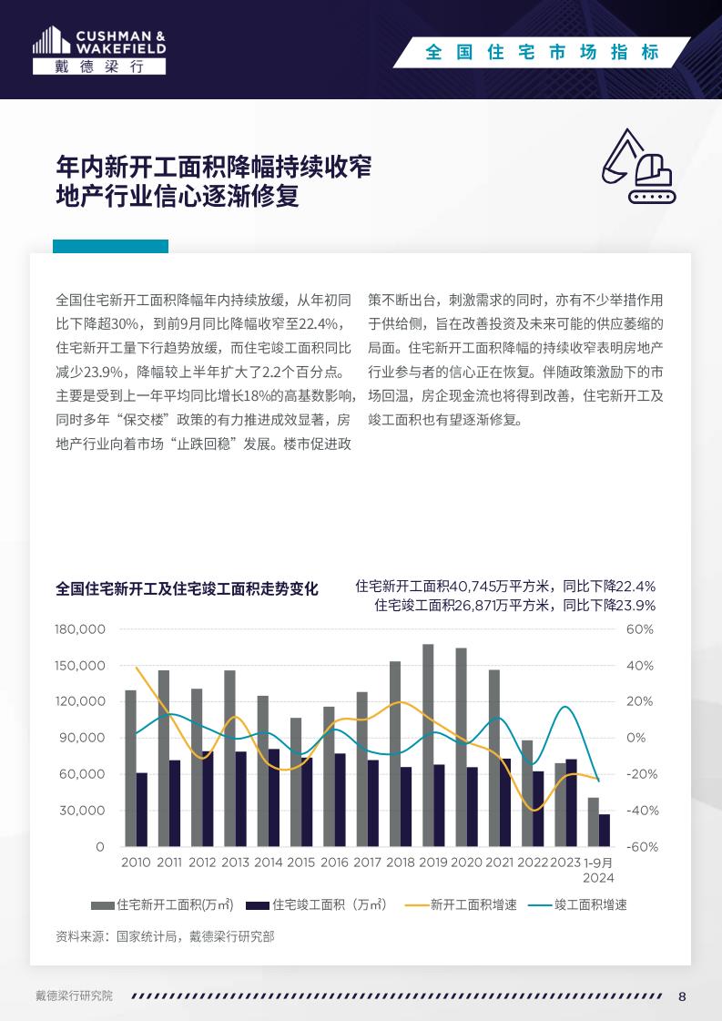 三季度末,央行提出降低存量贷款利率、统一最低首付比例、加大“白名单”项目贷款投放力度等多项举措助力房地产市场“止跌回稳”,再加上10月推出的一揽子增量政策组合拳,预计四季度国内房地产行业将出现好转,特别是住宅市场在低利率及低门槛的购房政策环境下有望迎来明显改善。