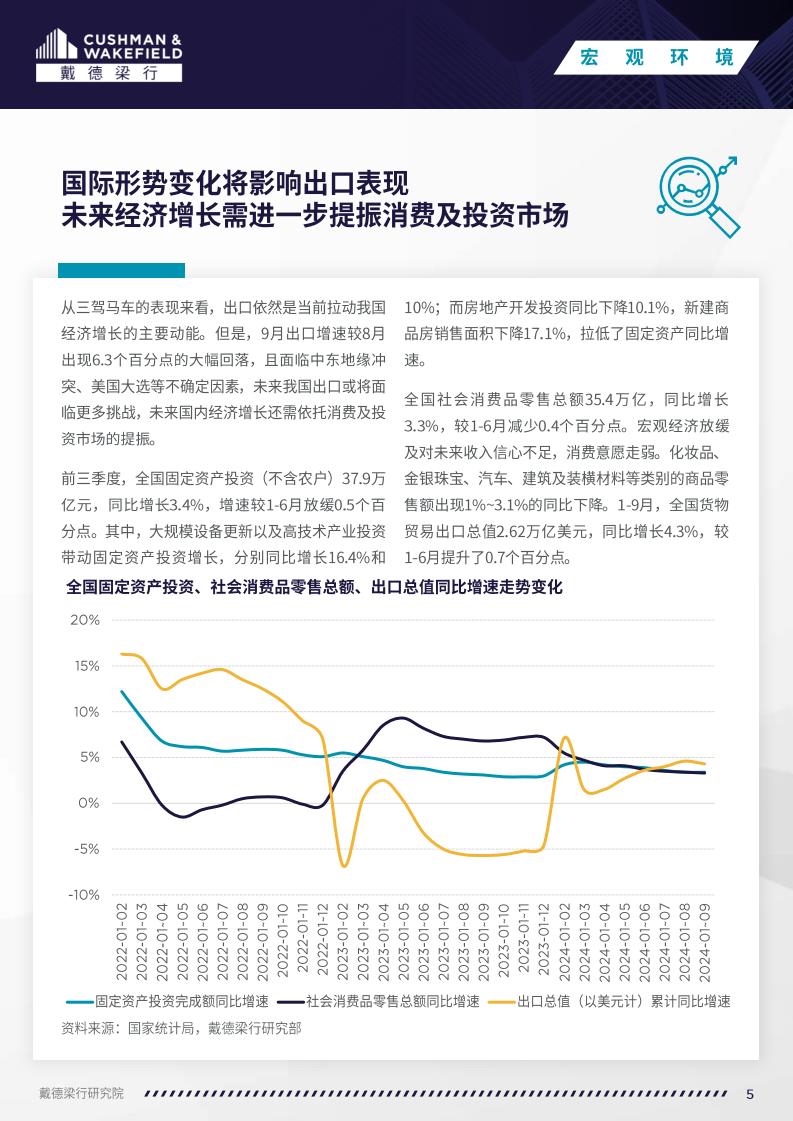 从三驾马车的表现来看,出口依然是当前拉动我国经济增长的主要动能。但是,9月出口增速较8月出现6.3个百分点的大幅回落,且面临中东地缘冲突、美国大选等不确定因素,未来我国出口或将面临更多挑战,未来国内经济增长还需依托消费及投资市场的提振。