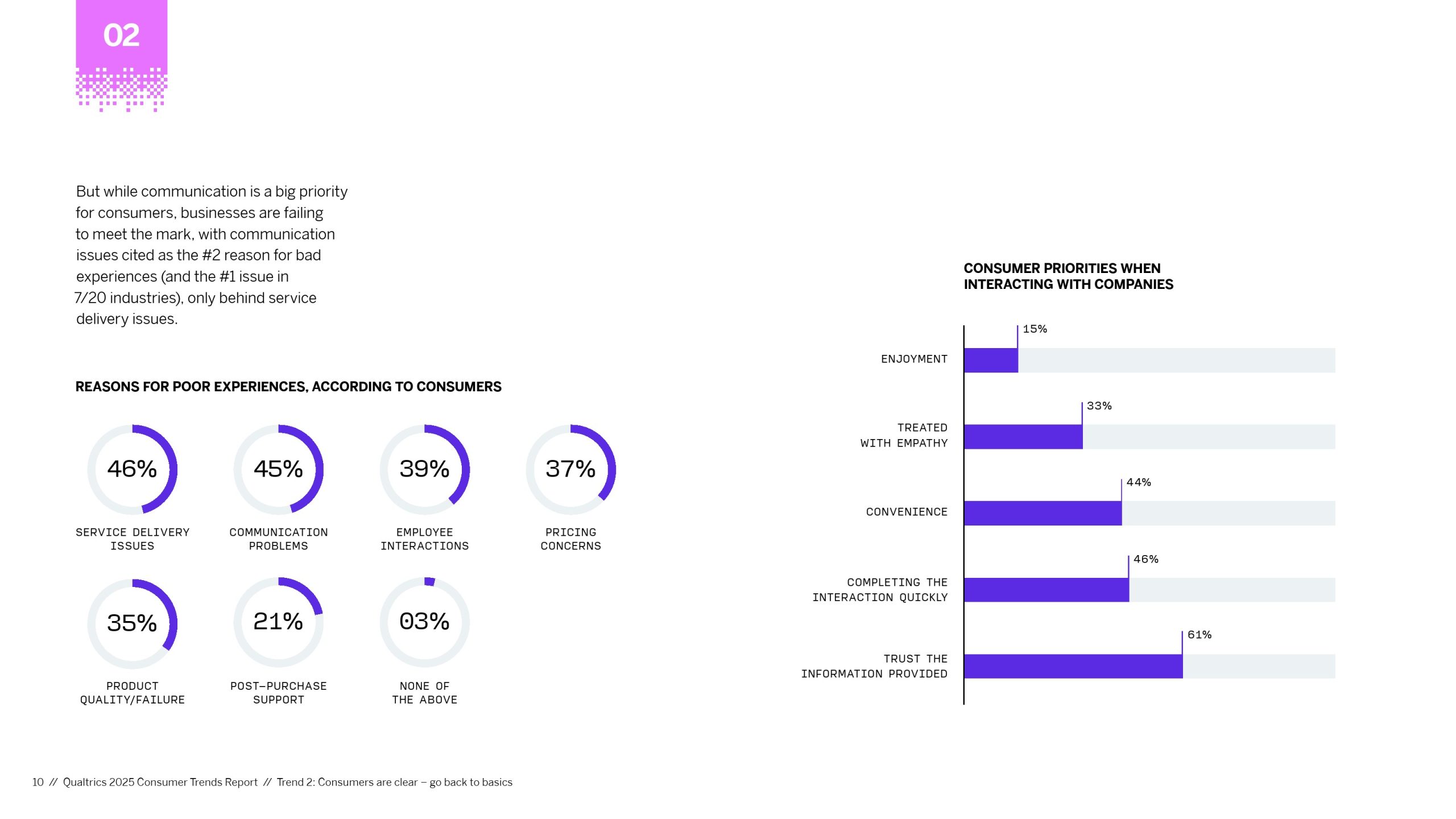 沟通是消费者优先考虑的关键问题,他们认为沟通问题是导致体验不佳的第二大原因,仅次于服务提供。