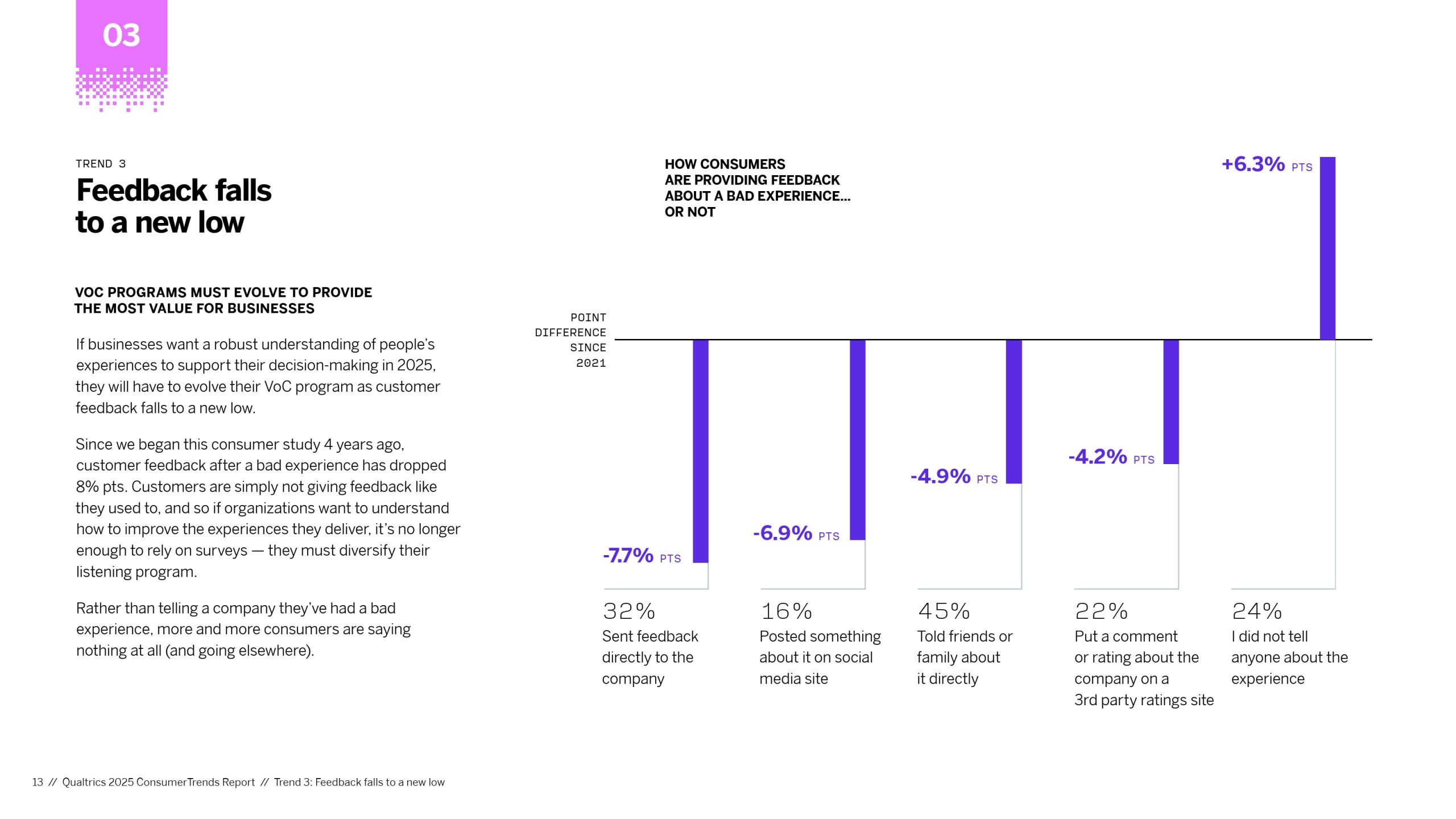 报告发现的一种趋势是消费者似乎对他们的糟糕经历保持沉默。与2021年相比,他们也不太可能直接告诉朋友或家人糟糕的经历(下降4.9%,达到45%),也不太可能在第三方评级网站上对公司发表评论或评级(下降4.2%,达到22%),也不太可能在社交媒体网站上发布相关信息(下降6.9%,达到16%)。