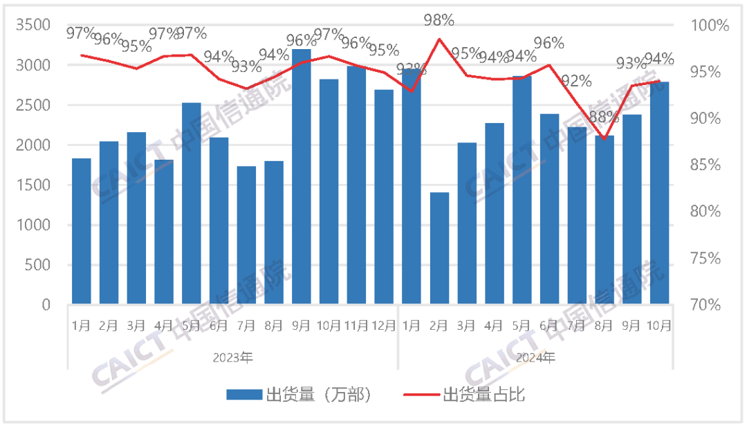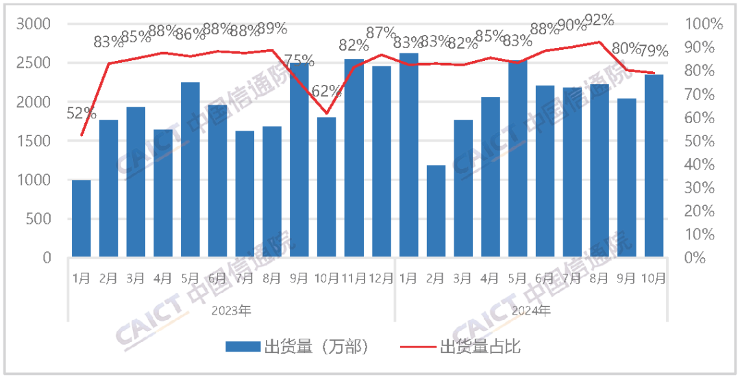 中国信通院今天公布了2024年9月国内手机市场运行分析报告。2024年10月,国内市场手机出货量2967.4万部,同比增长1.8%。其中,5G手机2672.2万部,同比增长1.1%,占同期手机出货量的90.1%。