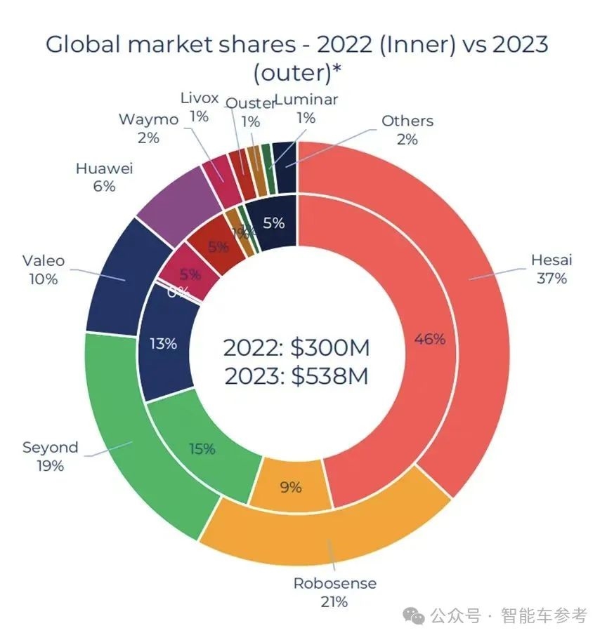 报告显示,2023年全球车用激光雷达市场份额 5.38 亿美元,同比增长80%。