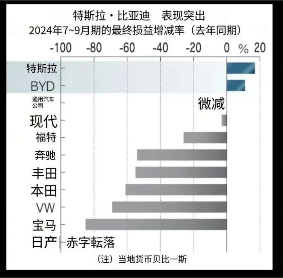 整体来说,全球主要11家车企业绩里,只有特斯拉和比亚迪在7-9月实现利润增长,分别同比提升了17%和11%。此外,丰田利润虽位居榜首,但同比下滑高达55%;日产出现93亿日元的最终亏损,管理层主动降薪;大众、奔驰和宝马等德国制造商也出现了超过50%的利润下滑。