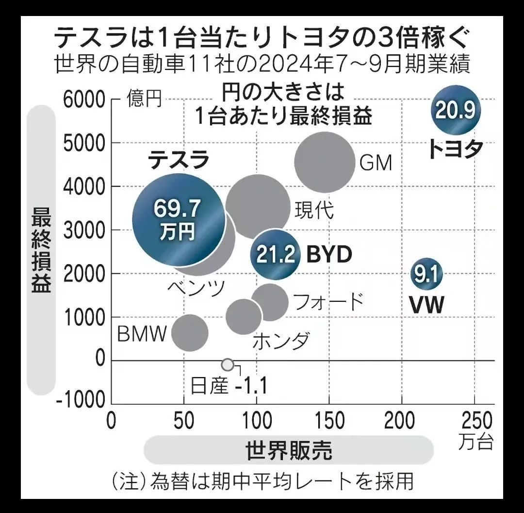 值得一提的是,单车利润方面,特斯拉名列前茅,以69万日元领先奔驰的47万日元,是丰田20万日元的三倍之多。