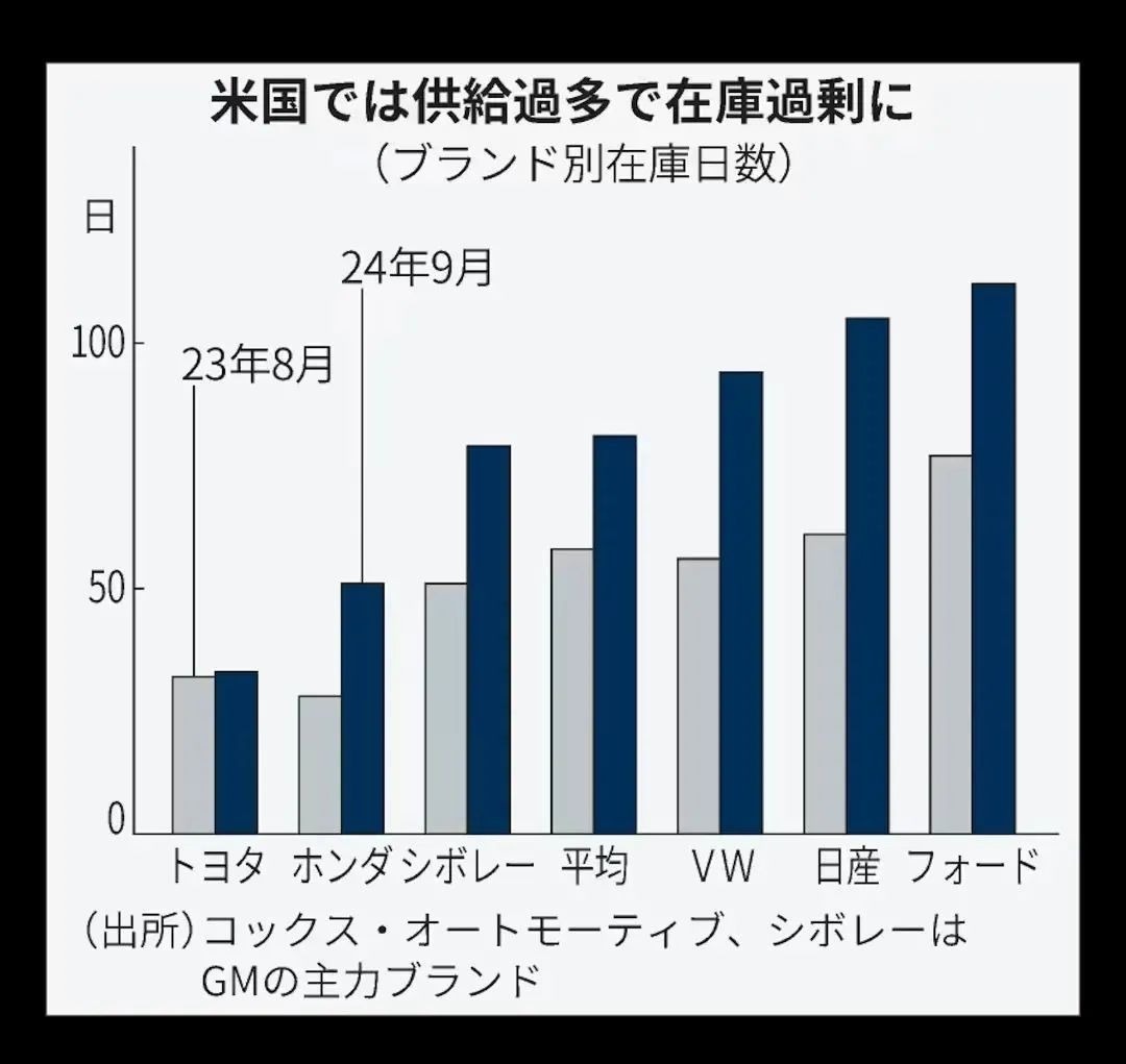 实际上,在北美市场启动鼓励金,早在新冠疫情压顶的2021年左右,日系车企就频繁在美国刺激消费。按照《日本经济新闻》统计,日产因为缺乏北美市场的混合动力车型,库存天数达到了105天,激励金增至4500美元以上,但依旧免不了亏损。